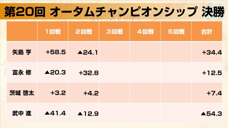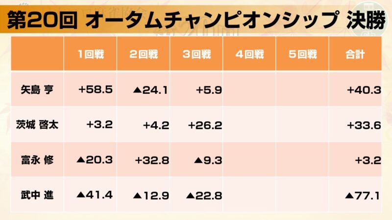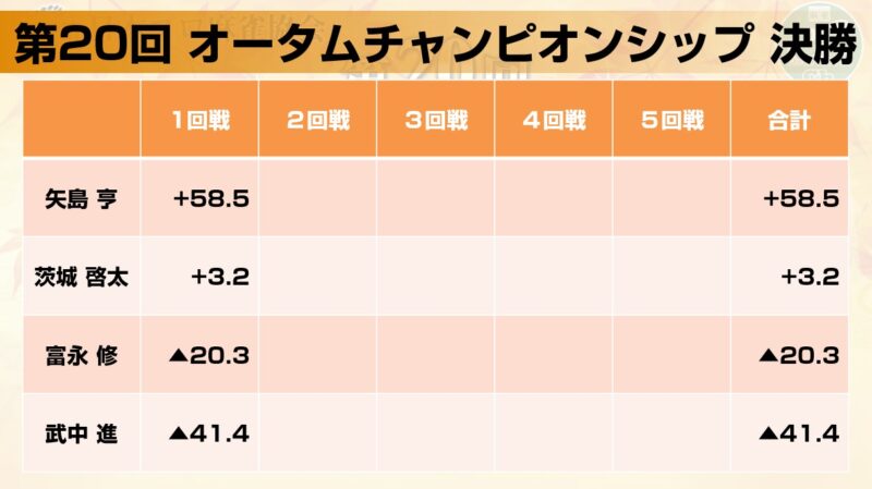 【担当記者:五十嵐 毅】 4連覇の懸かる矢島が首位。しかし、2位の富永とは26.9P差、3位の茨城とは31.3P差と、非常に心許ないリードである。 …
