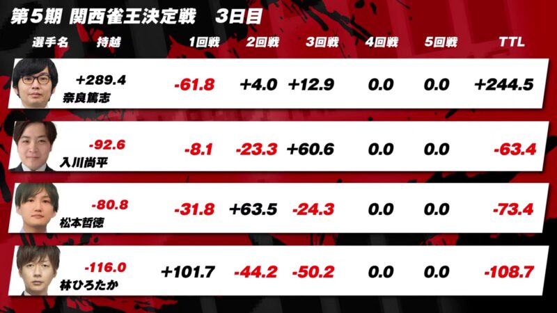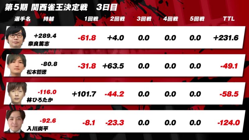【担当記者:角谷ヨウスケ】 今日トップをとっている松本と林がトータル1位の奈良まで280-290ポイントの差。入川が355ポイント差。全15回戦…