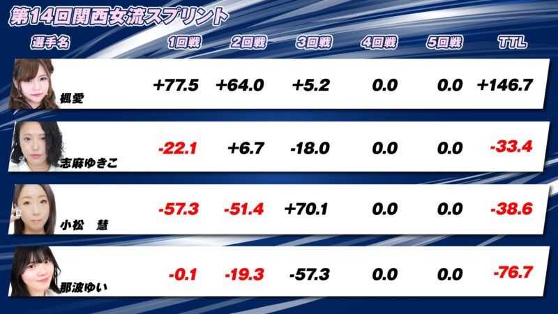 【担当記者:田村翔梧】 3回戦志麻(-15.4)→小松(-108.7)→楓愛(+141.5)→那波(-19.4) 楓愛連勝 小松連ラス。3回戦での…