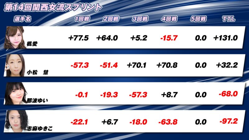 【担当記者:田村翔梧】 最終戦 楓愛 +131.0 小松 +32.2 那波 -68.0 志麻 -97.2 優勝条件は、 小松は楓愛と9…