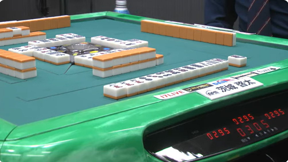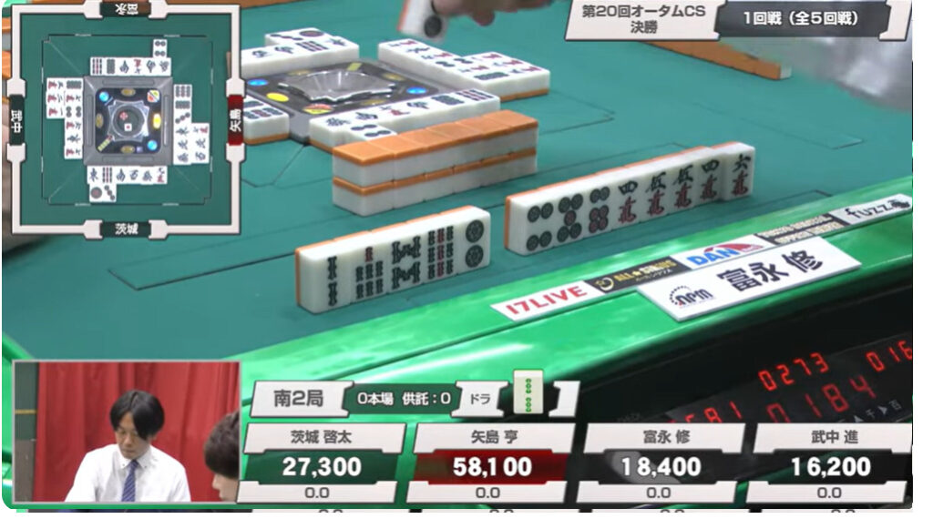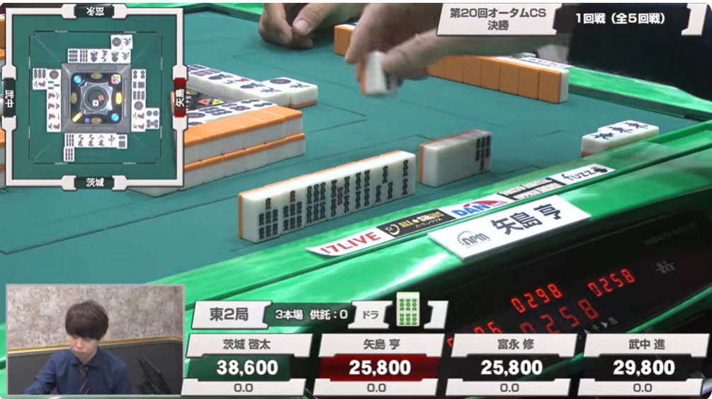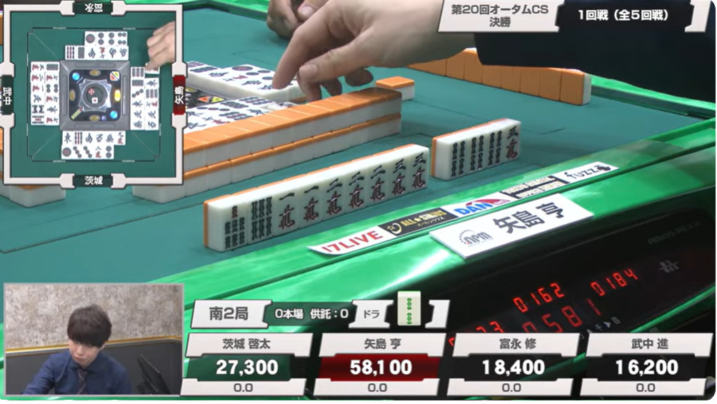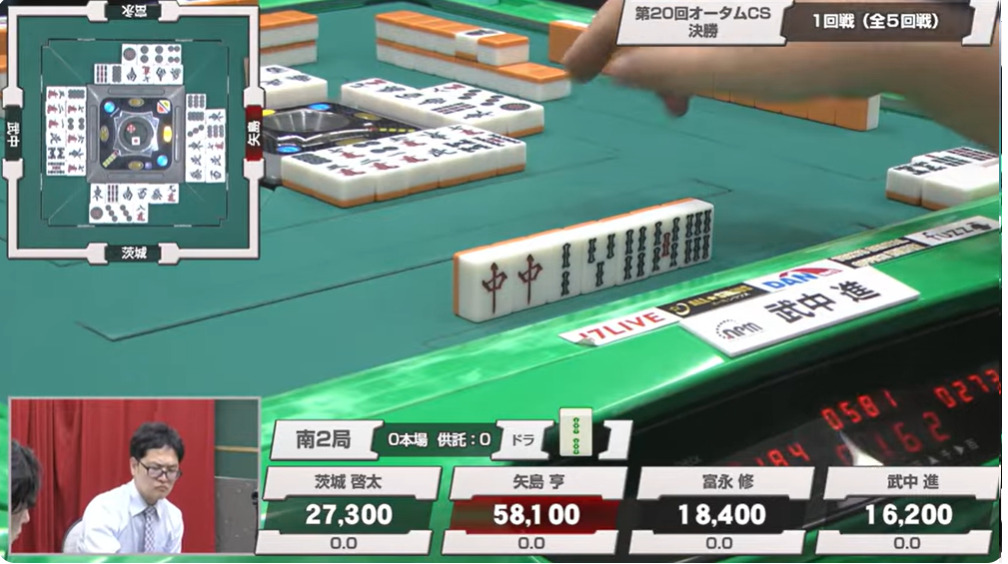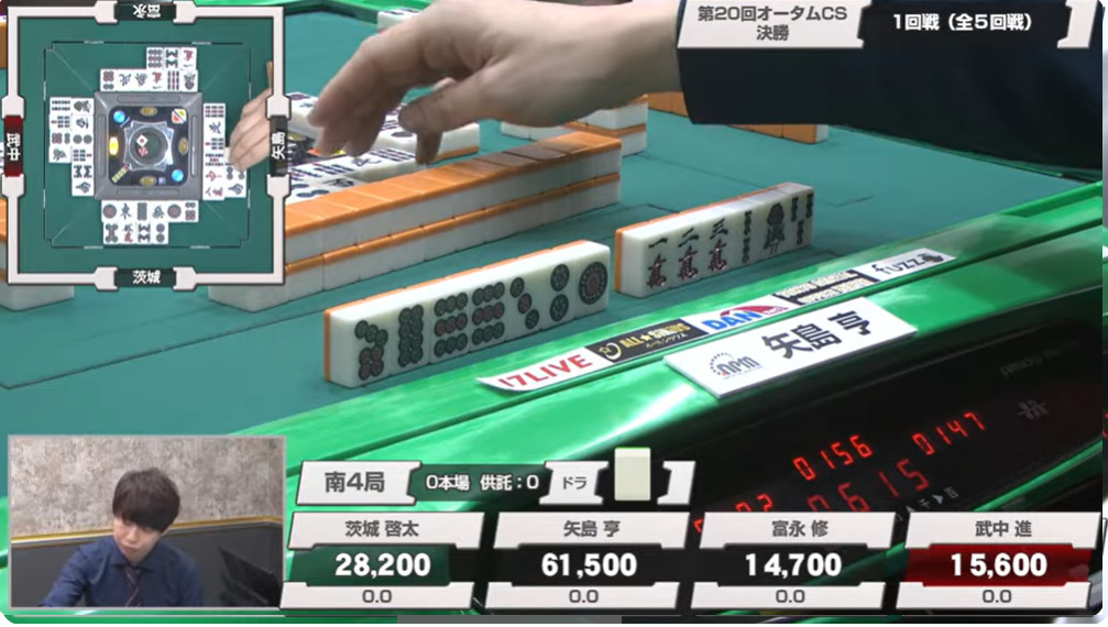 1本場は茨城がヤミテンのままツモ。3メンチャンとはいえ、このルールでドラも何もない手ではリーチと行けるはずがない。