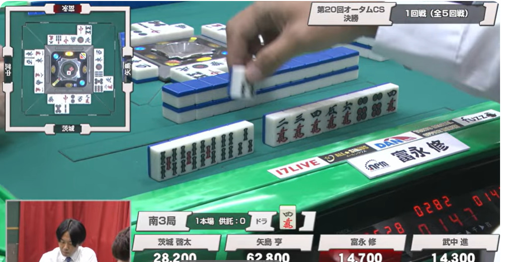 富永修、第19期雀竜位。そしてオータムはこれが3度目の決勝。17回はサイコロ太郎の前に敗れ、昨年は矢島の前に敗れた。それだけに今期は期するものがあるだろう。そもそも2年連続決勝進出が相当の難易度なのだ。