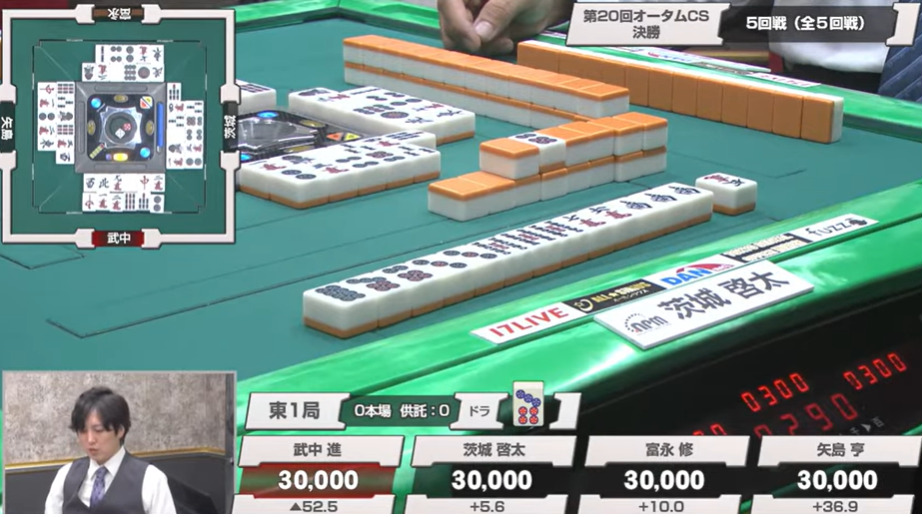 東1局、南家の茨城が自風アンコ、ドラを使った手でリーチ。ツモってまず満貫のリード。