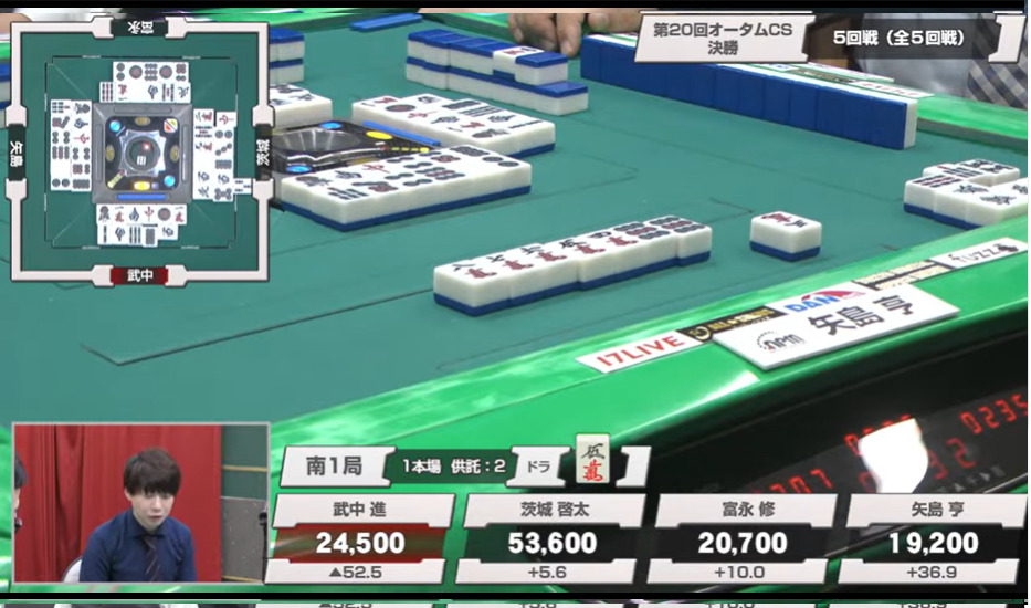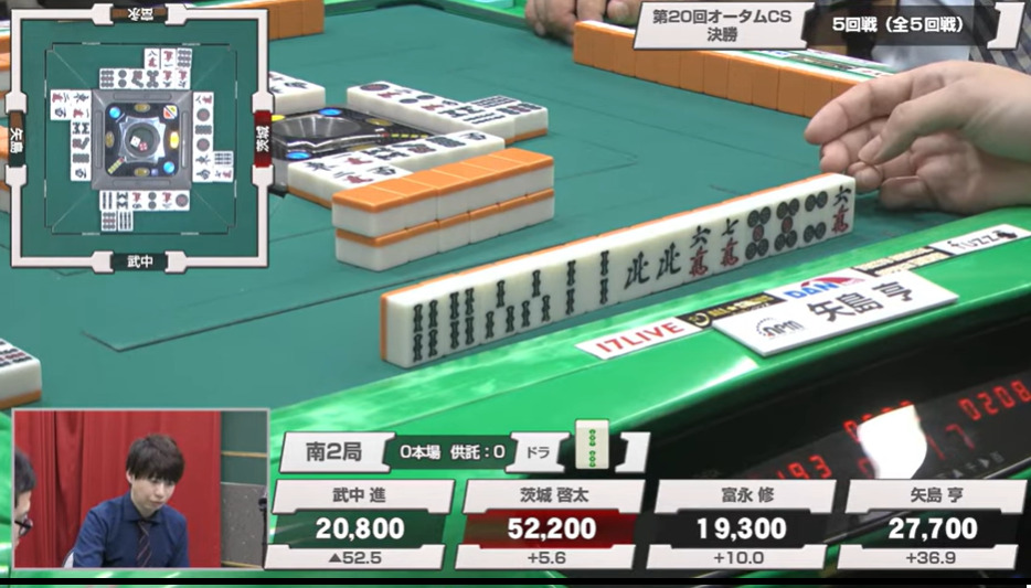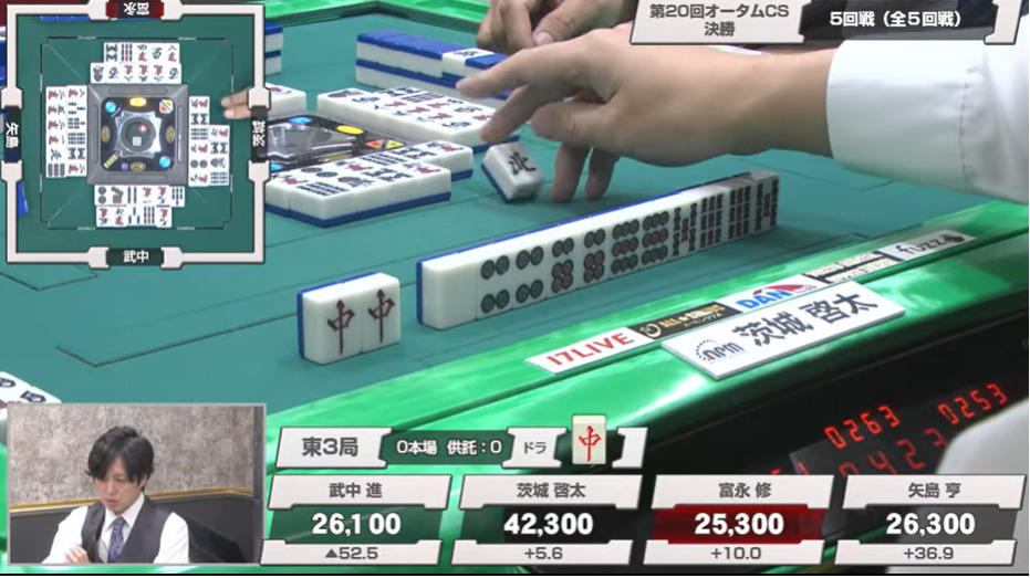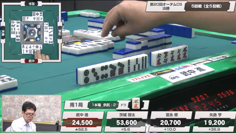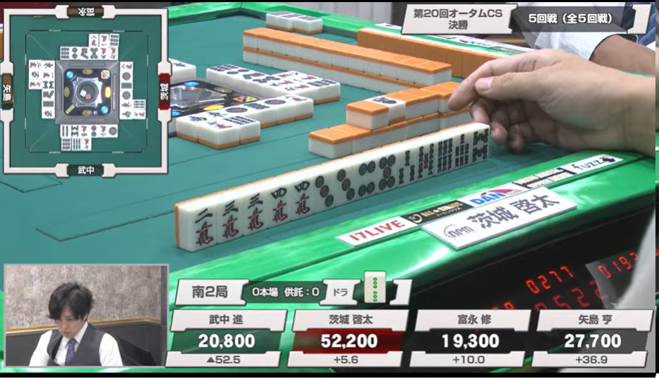 勝負か。リーチ後にドラを引いたりすることを考慮してヤミテンの可能性はあるが、次巡即ツモとなる茨城のアガリは動かない。
