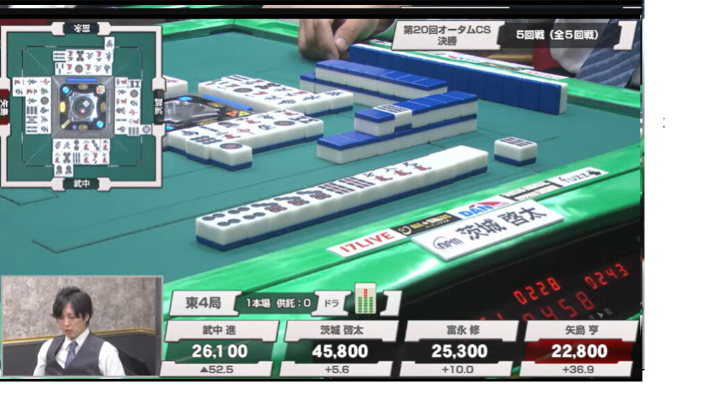 富永の親も終わり、あとはオーラス、親の矢島がどこまで粘れるかとなったが、矢島の手はイーシャンテンになったあと、–