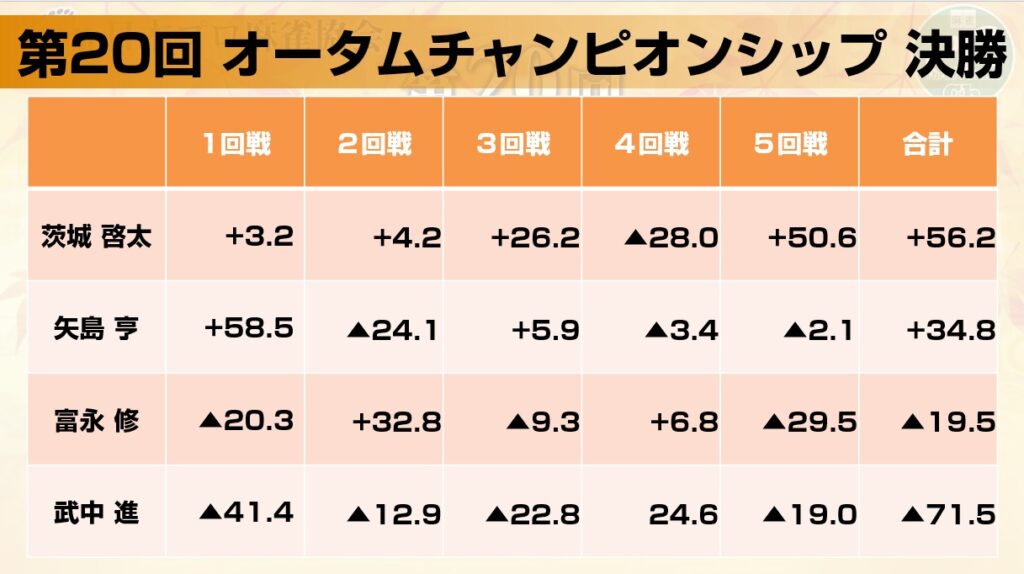 優勝は茨城啓太。8期前期入会で、同期からは女流雀王2人(大崎初音、冨本智美)、新人王2人(小川裕之、黄河のん)、が出ているが、茨城が2人目のオータム覇者となった。もう1人は第15回の千貫陽祐だが、来期はA1リーグで2人の対決が見られるだろう。