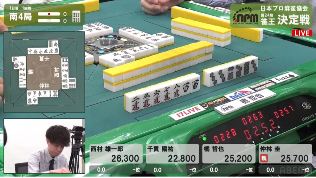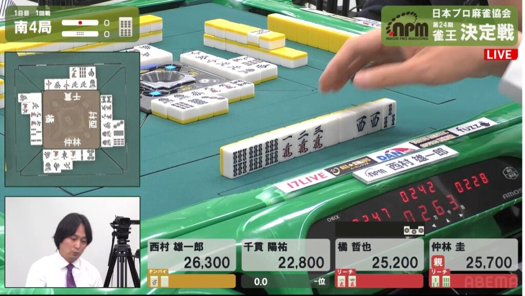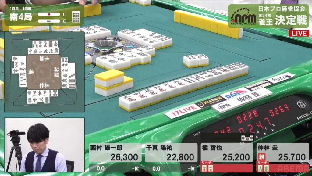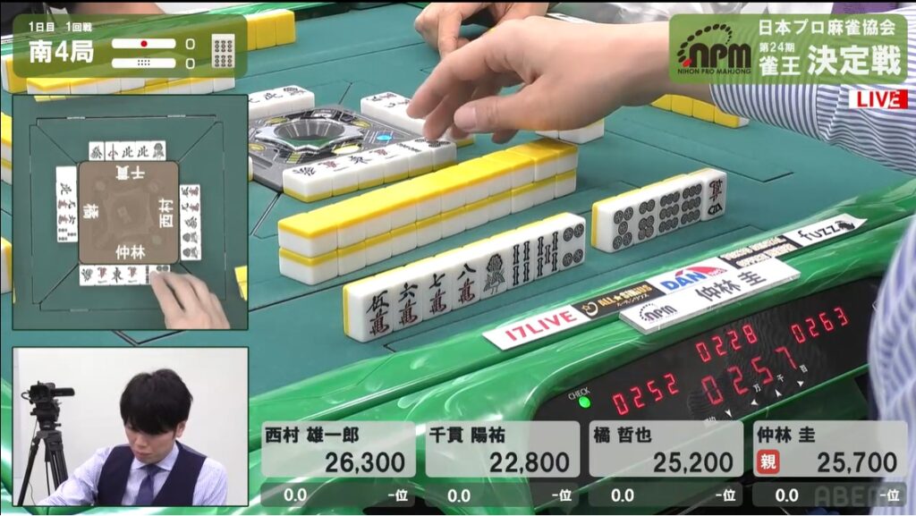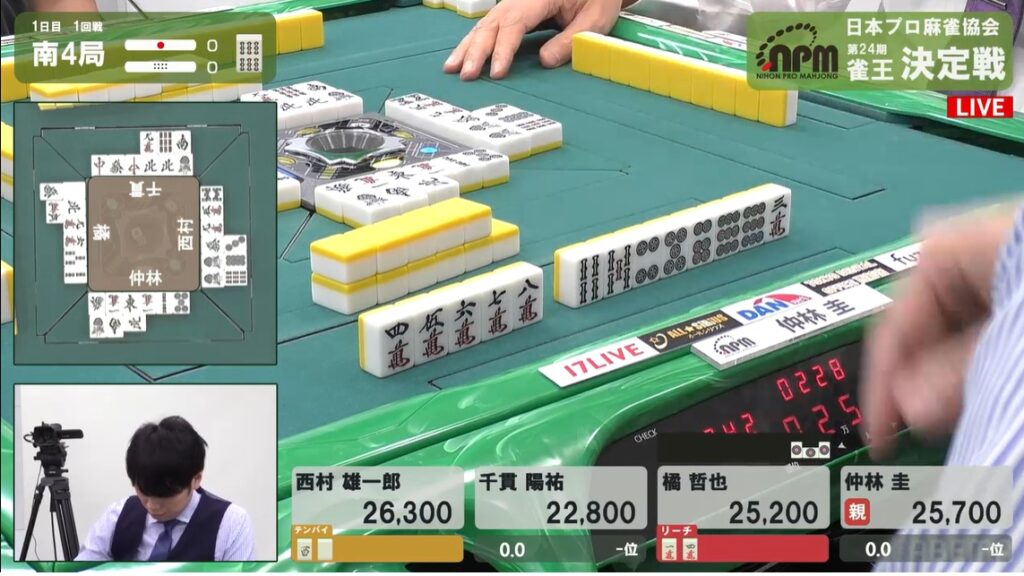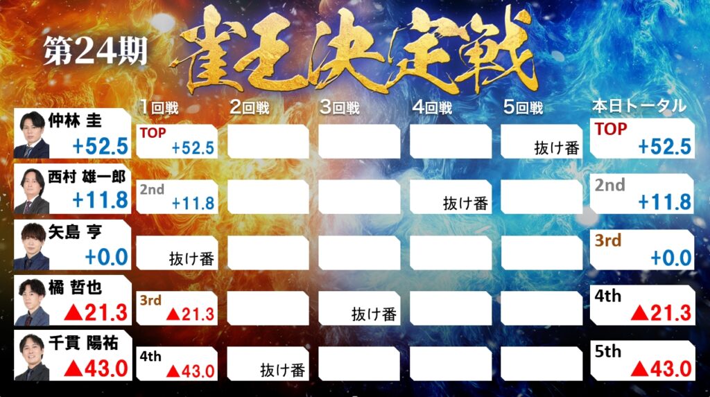 結果としてこのアガリで順位変動は起きず、1着仲林、2着西村、3着橘、4着千貫で1回戦を終えた。