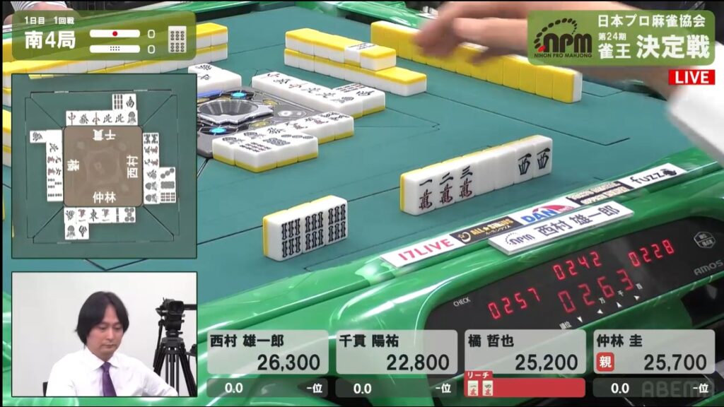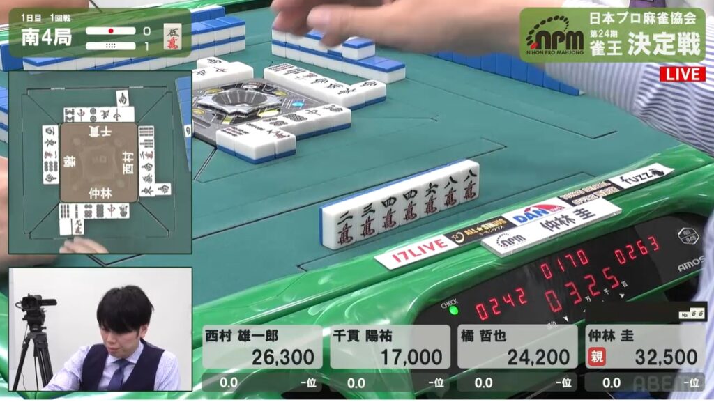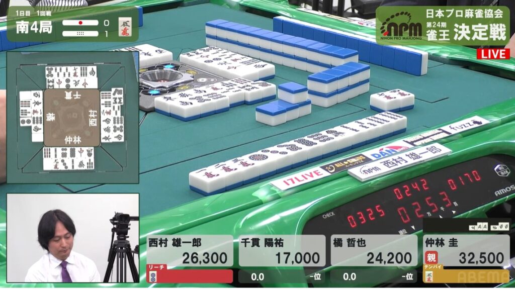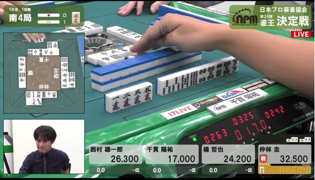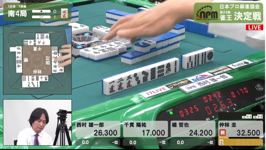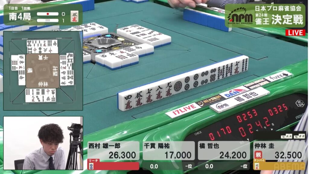 結果としてこのアガリで順位変動は起きず、1着仲林、2着西村、3着橘、4着千貫で1回戦を終えた。