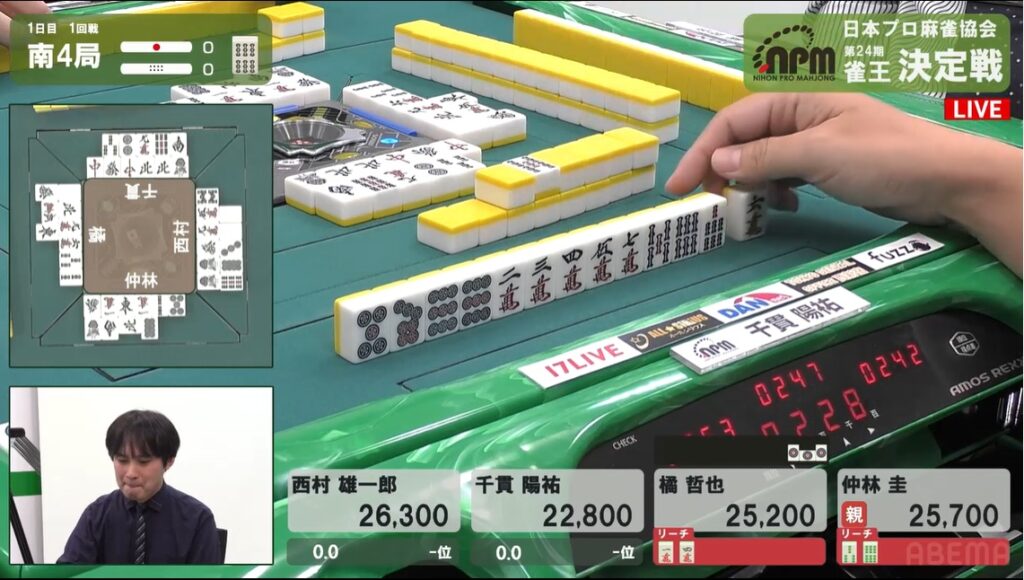更なる加点を目指しつつ、放銃すれば着落ちになる西村・橘にプレッシャーをかける。