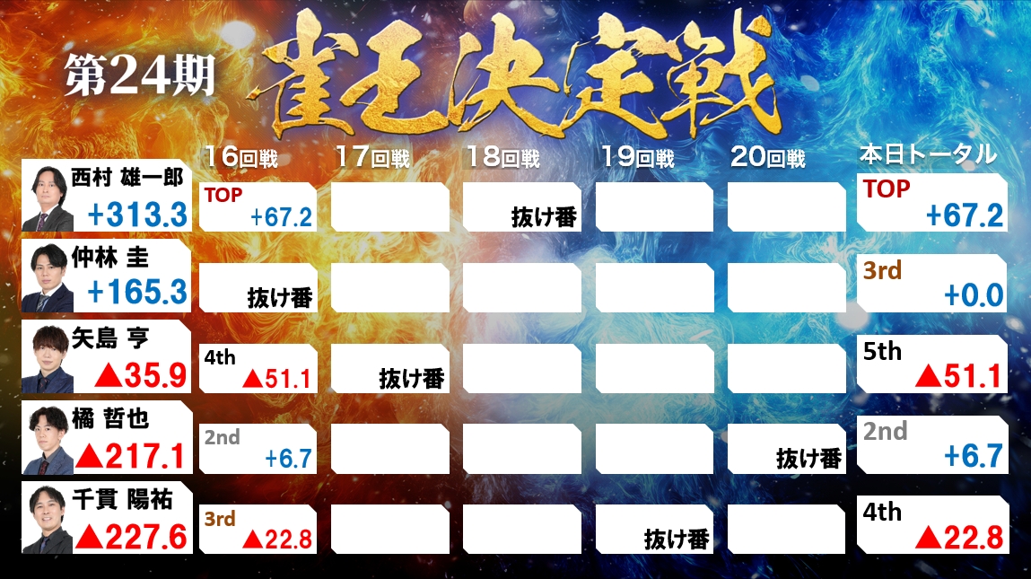 16回戦で西村がトップを取ったことにより西村と一番近い仲林でも約150P、千貫、橘に至っては550P近くの差がついている。
