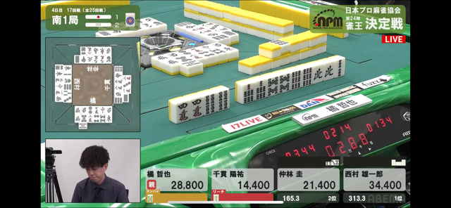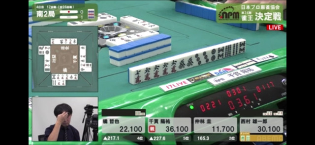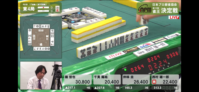 西村とは現状6400点差、千貫とは25600点差、跳満を二回ツモで大逆転。1300/2600でも西村より上に行くことができる。