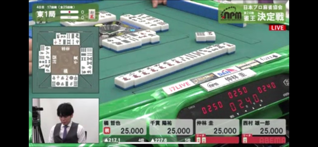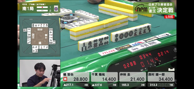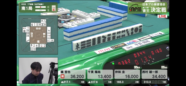 千貫の三色は頭ハネで無効。橘がこれでこの半荘のトップに再浮上。