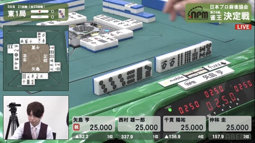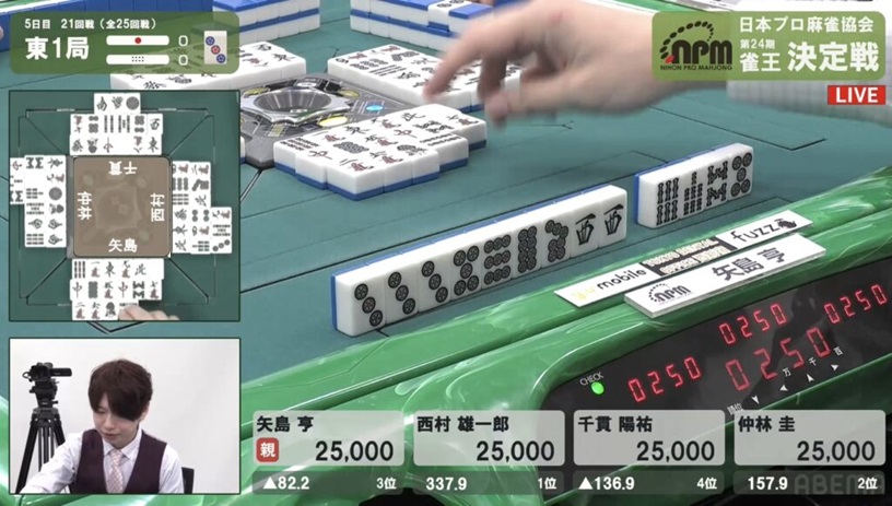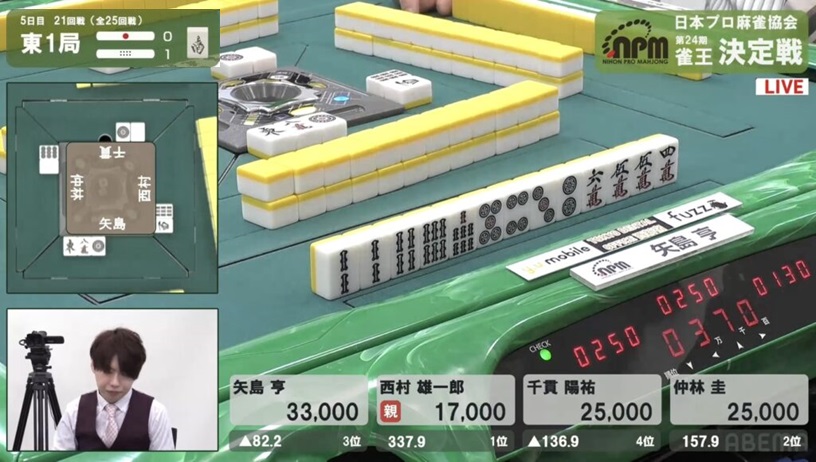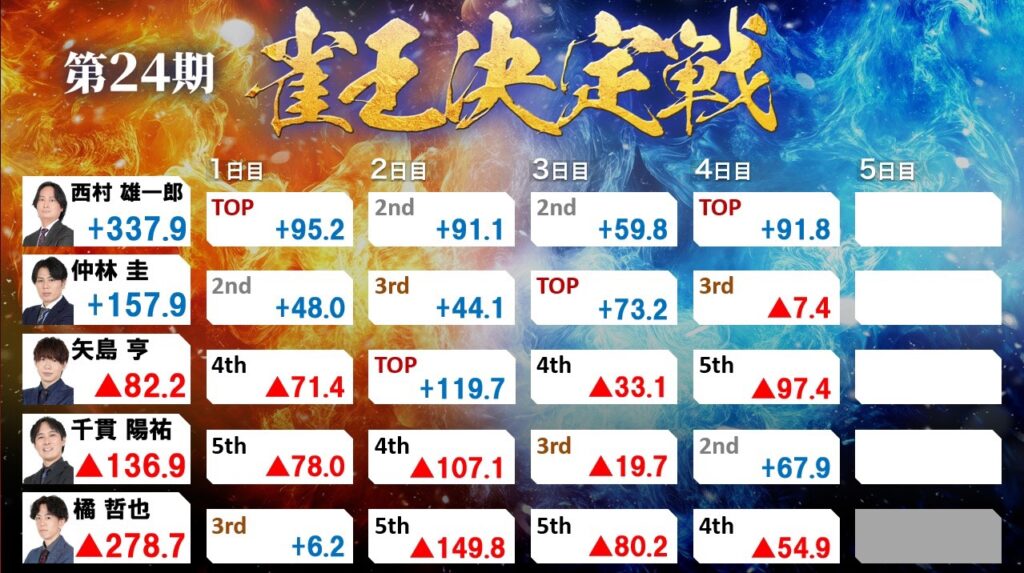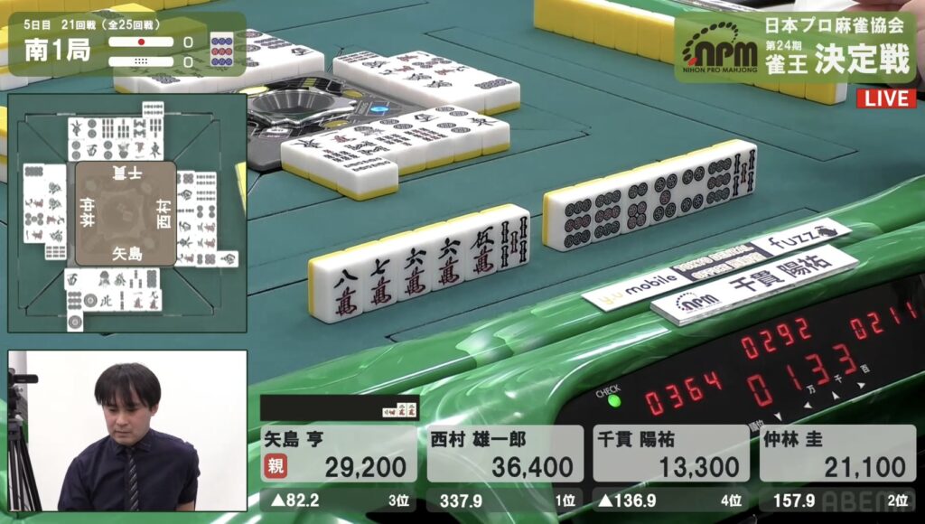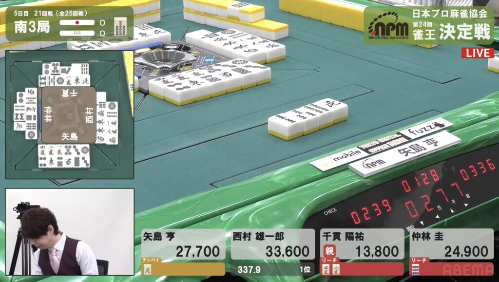これは流石に止めることはできず、西村の12,000放銃で決定戦最終日が開幕した。