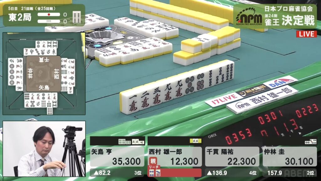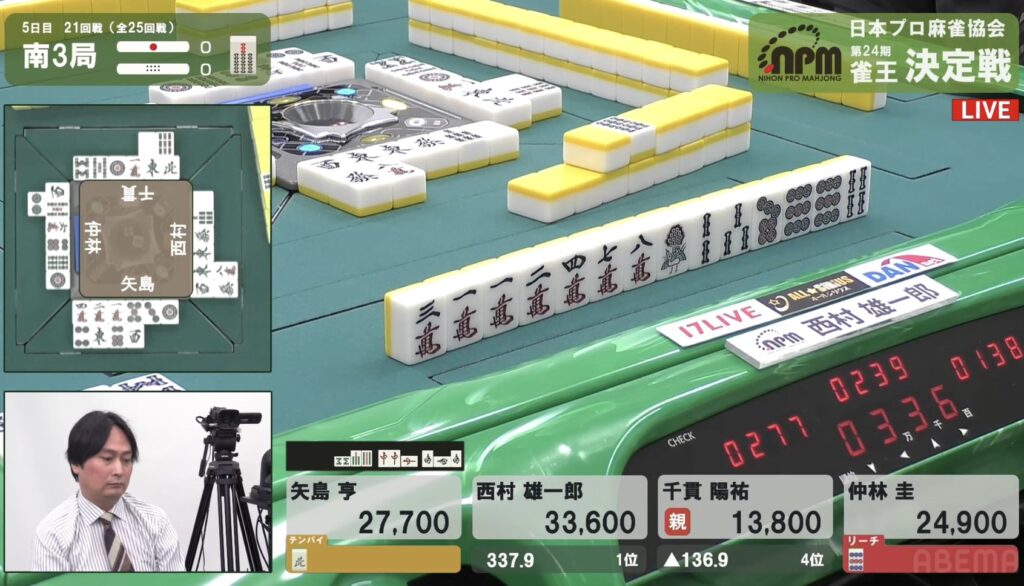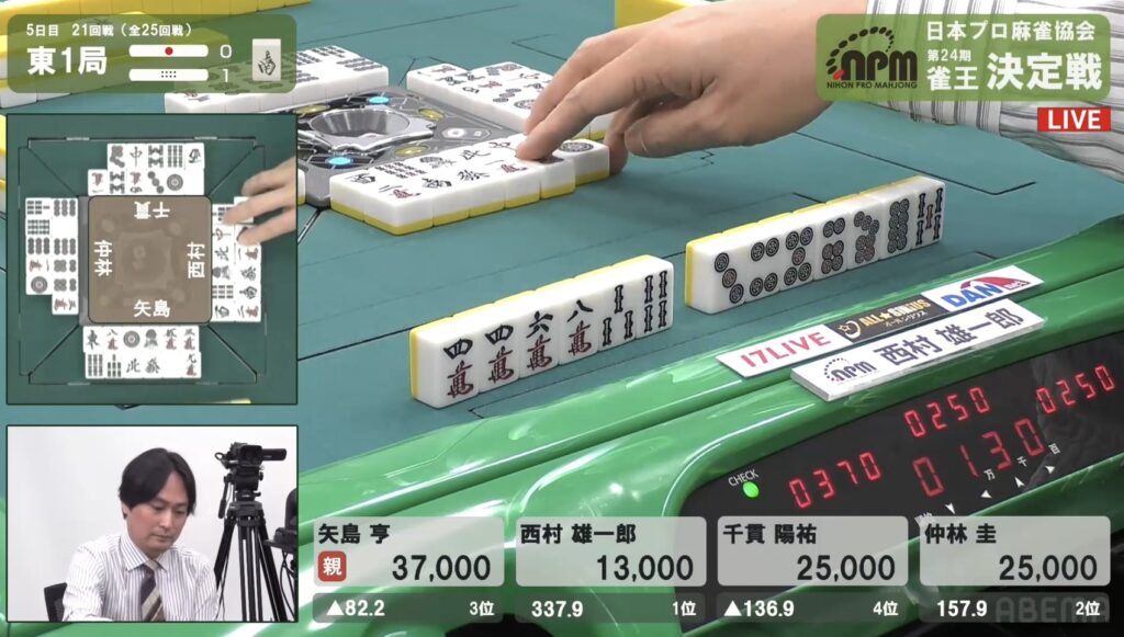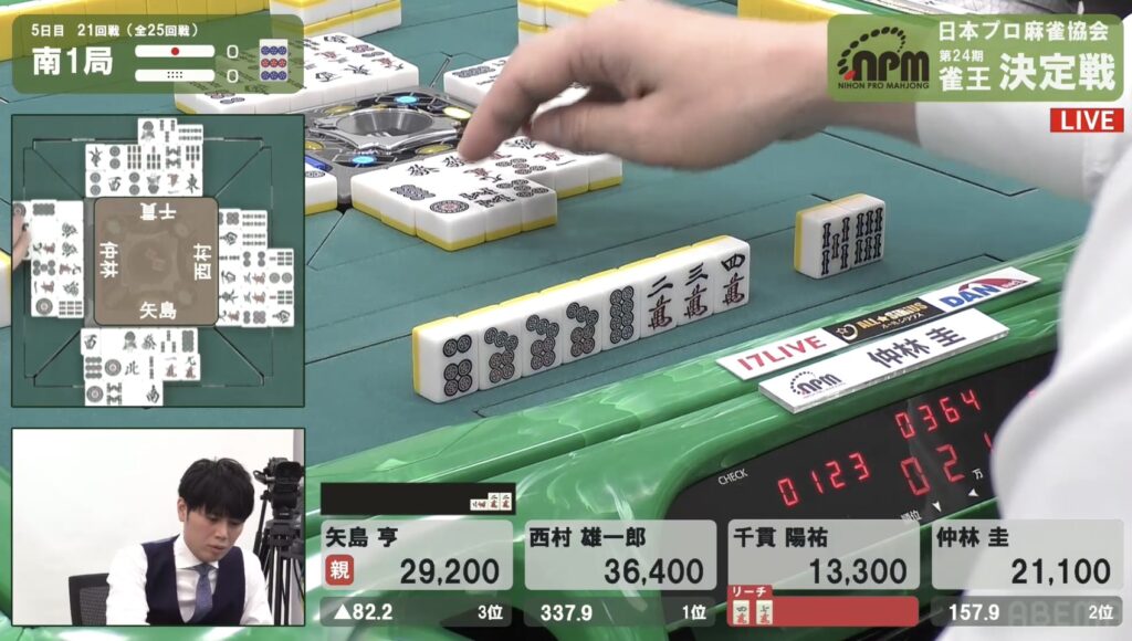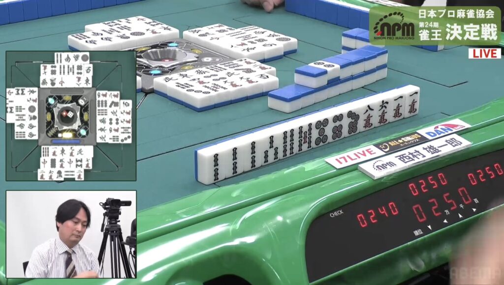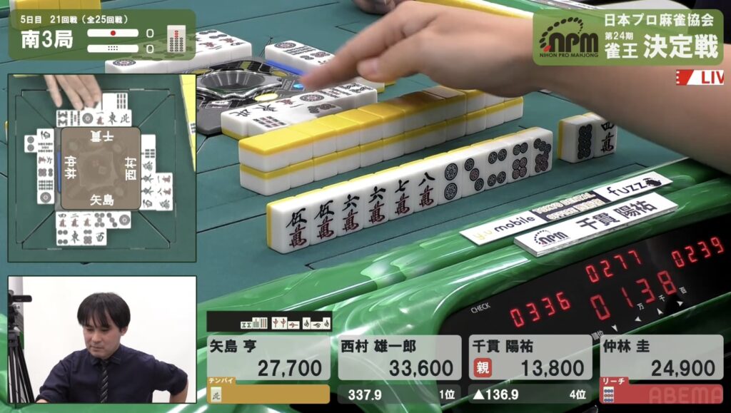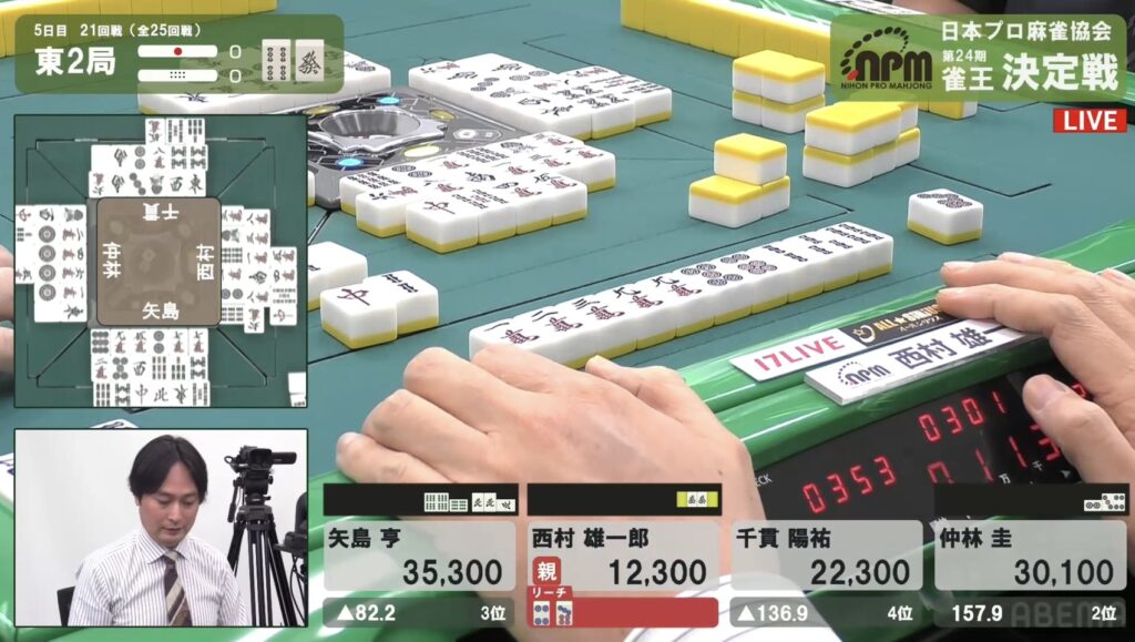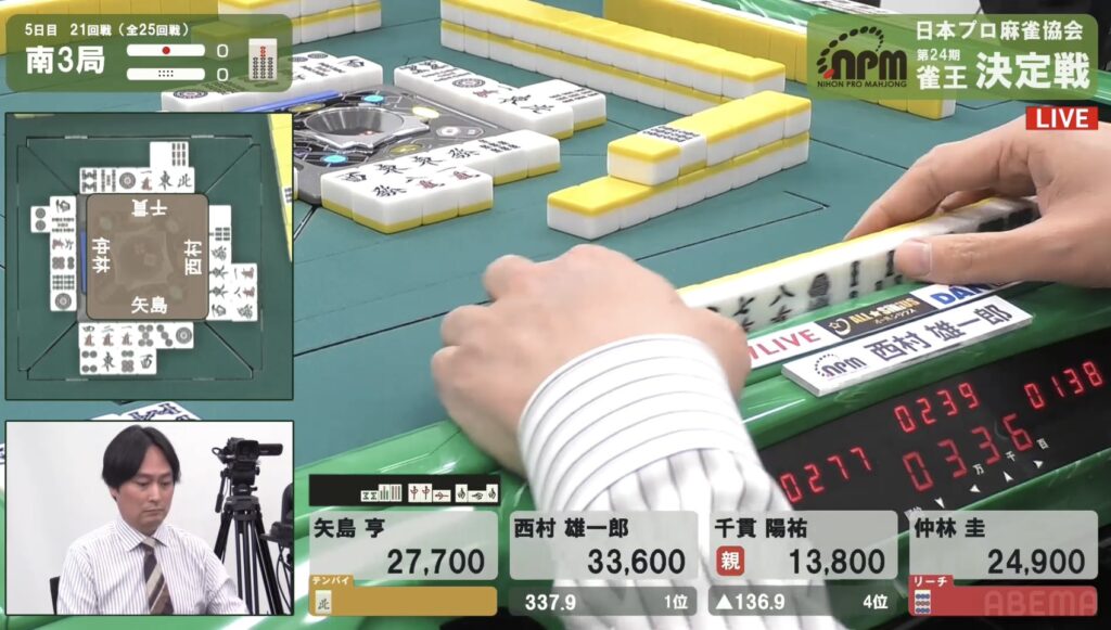 西村も同様にテンパイを入れたが、リーチとはいかない。