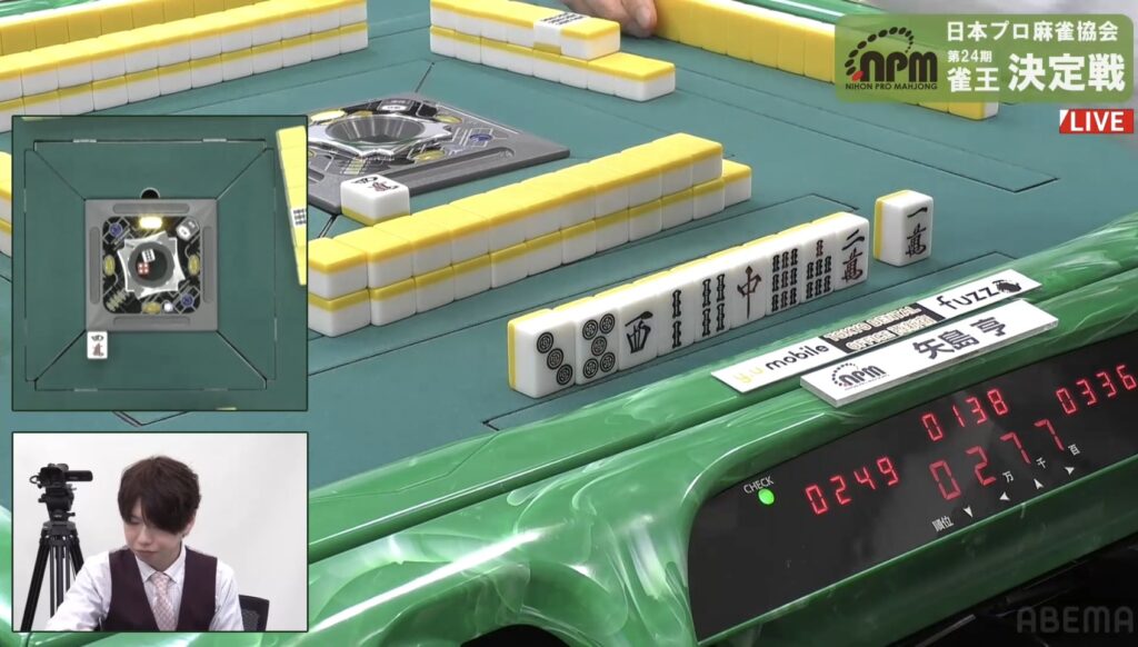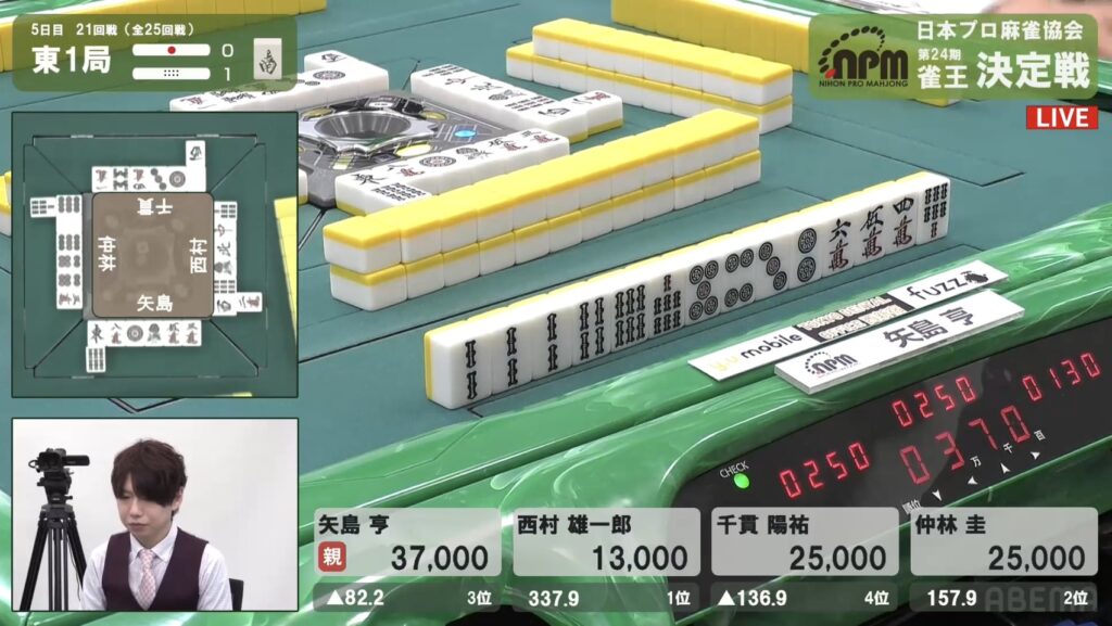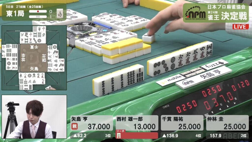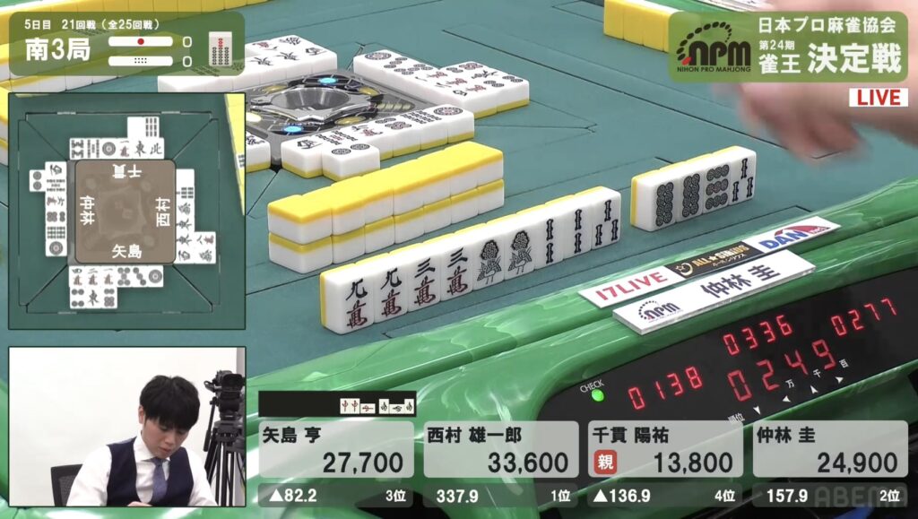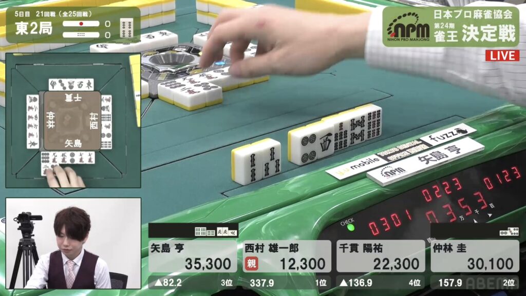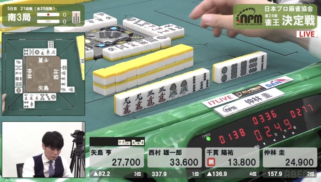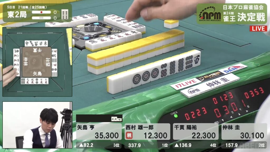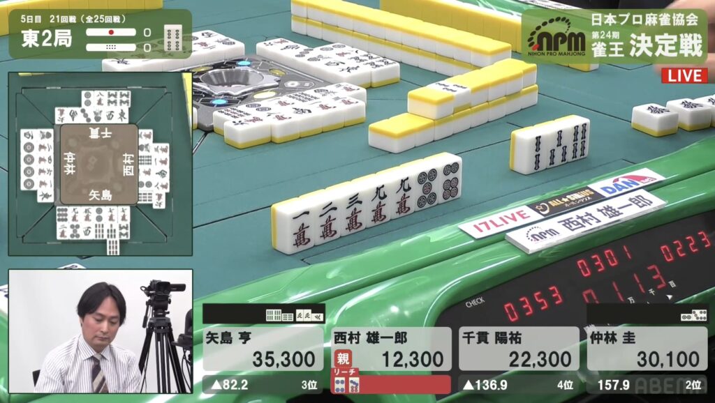 西村も同様にテンパイを入れたが、リーチとはいかない。