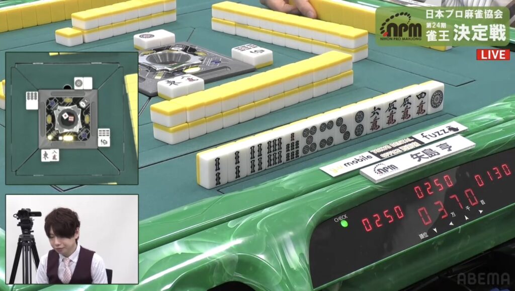 親の矢島がドラアンコの配牌を、丁寧に仕上げてイーシャンテン。か