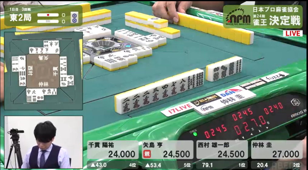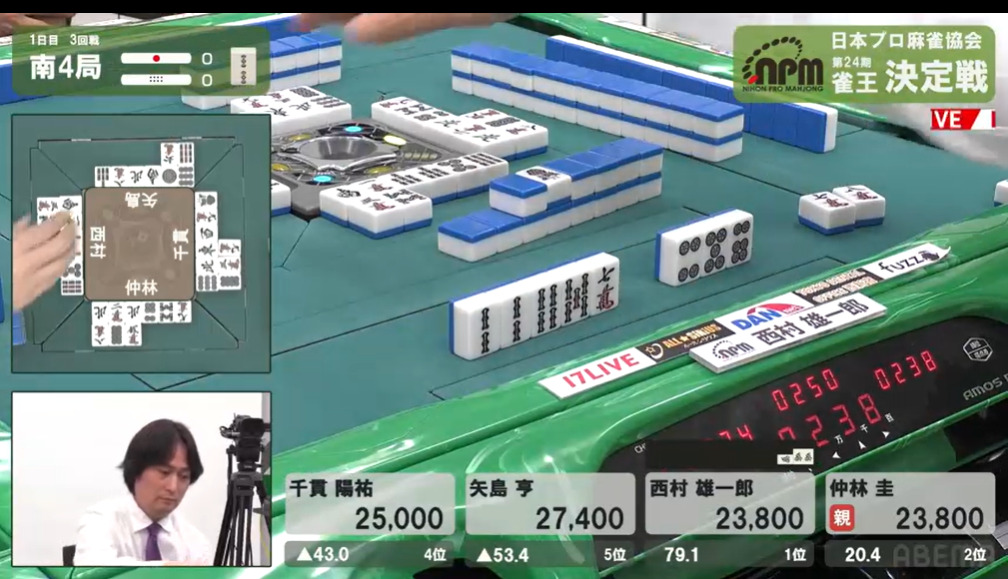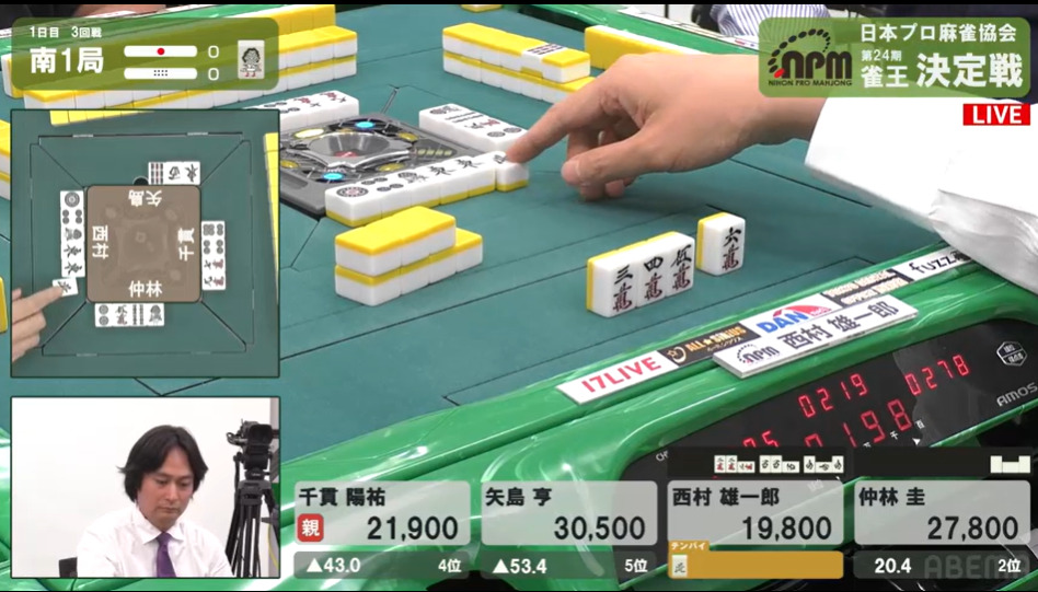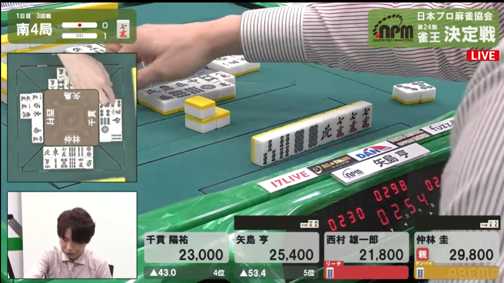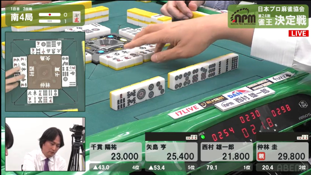 結果は西村がを掴んで放銃。矢島がトップに返り咲いた。