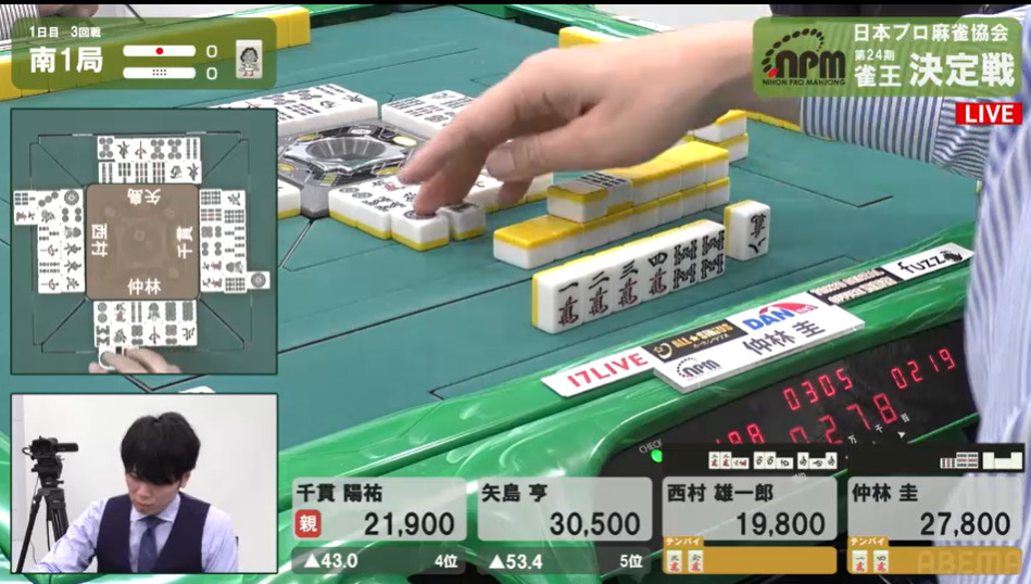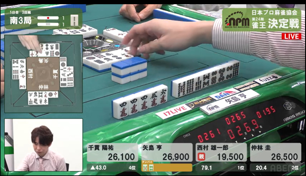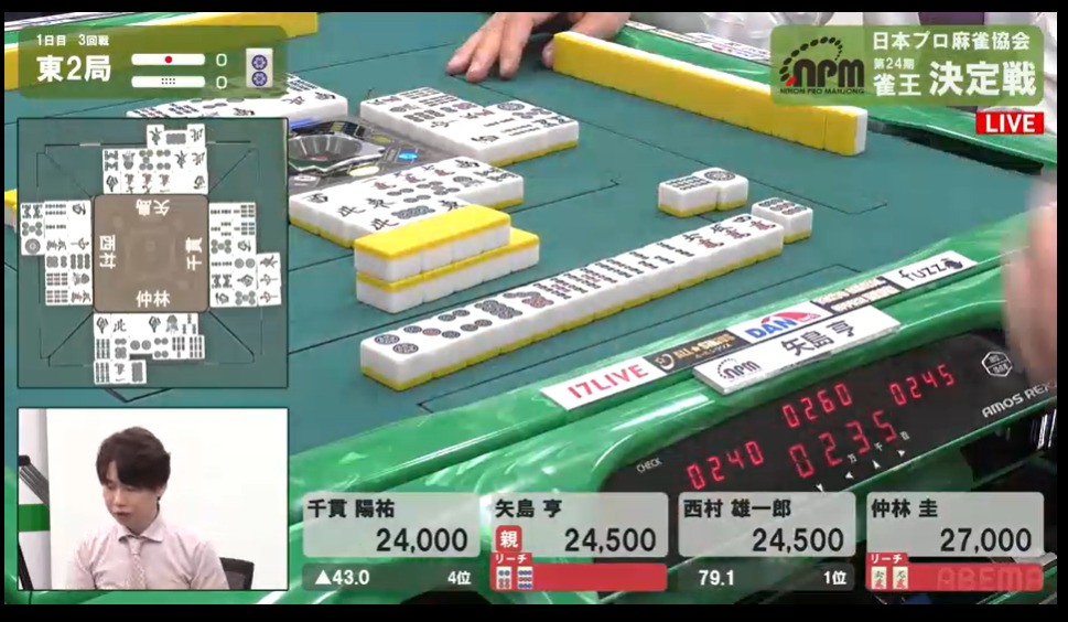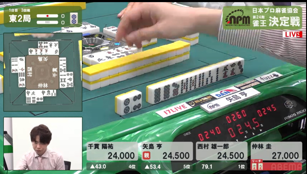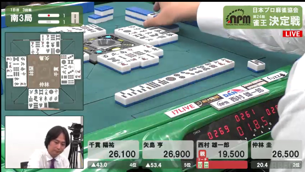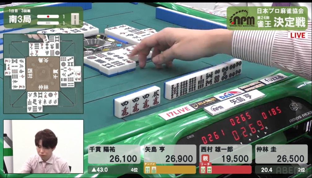 14巡目、西村がリーチ。ここにをツモった矢島はあっさりと通っている