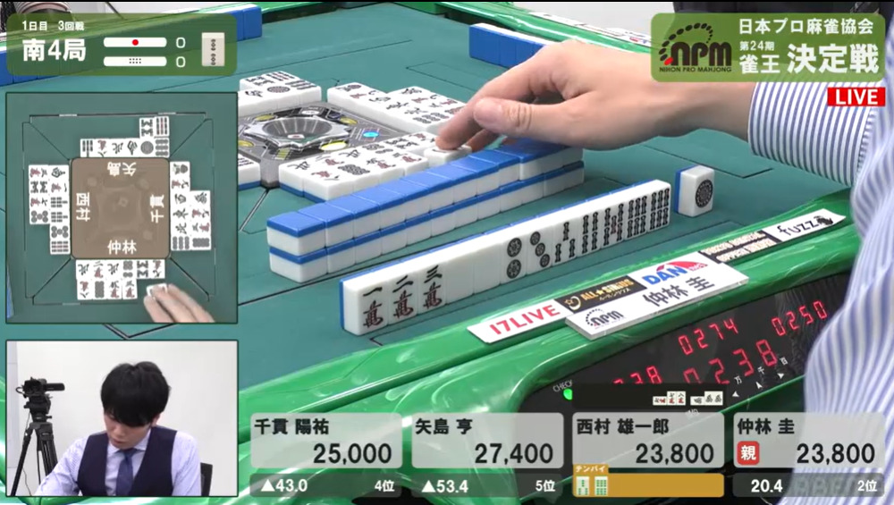 親の仲林は西村と同点3着だが、誰に何をツモられても単独ラス。2局前の西村と同じくオリを選ぶことはほとんどない状況だ。