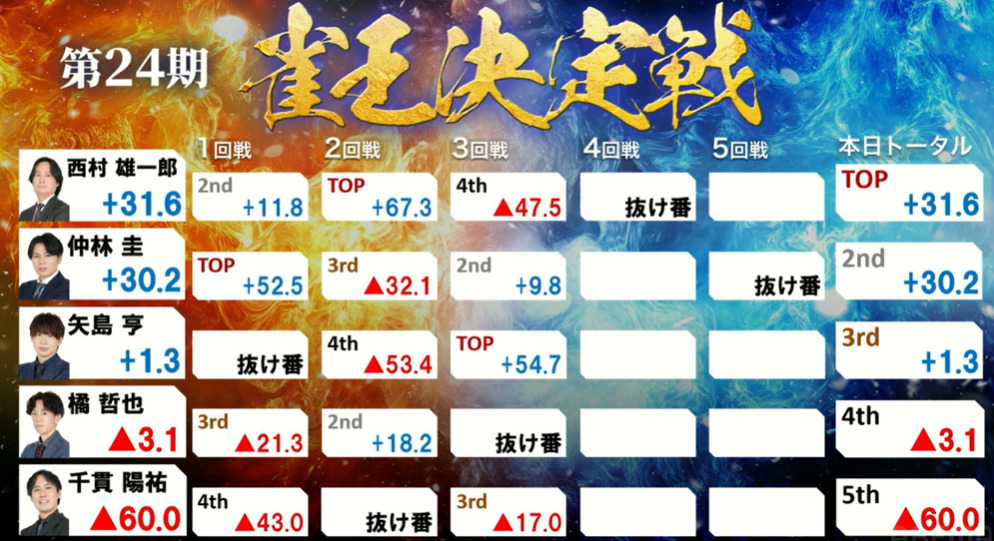 終始息詰まるような僅差の展開だったが、ここまでの2回を2着とトップでリードしていた西村がラスとなったためにトータルポイントも千貫以外の4人は「集合」してしまった。