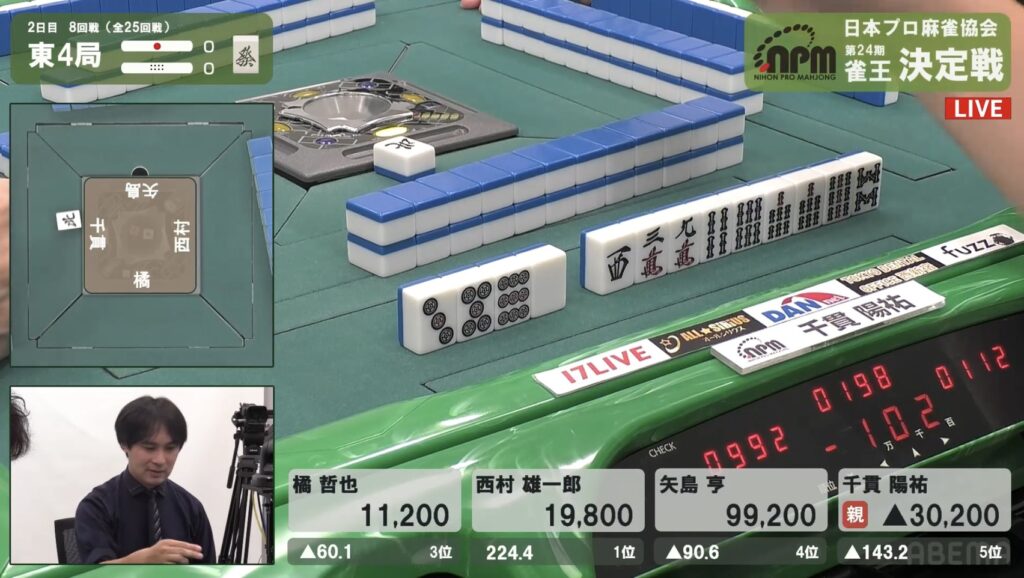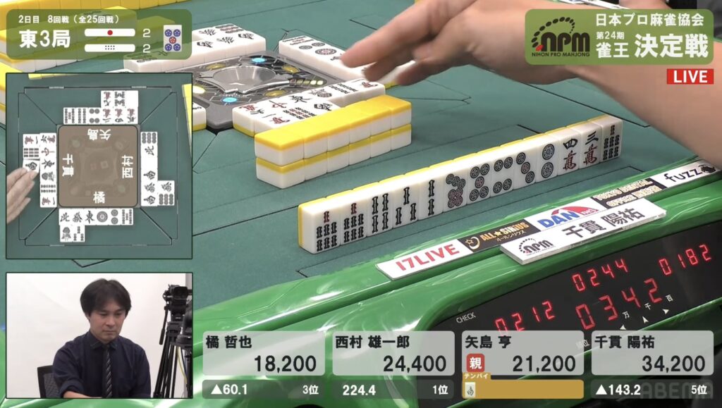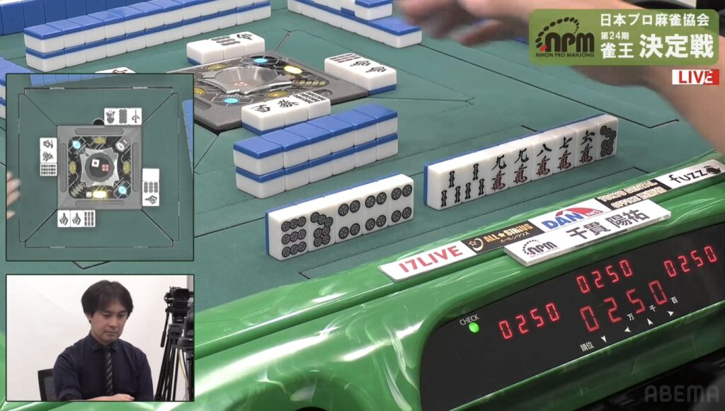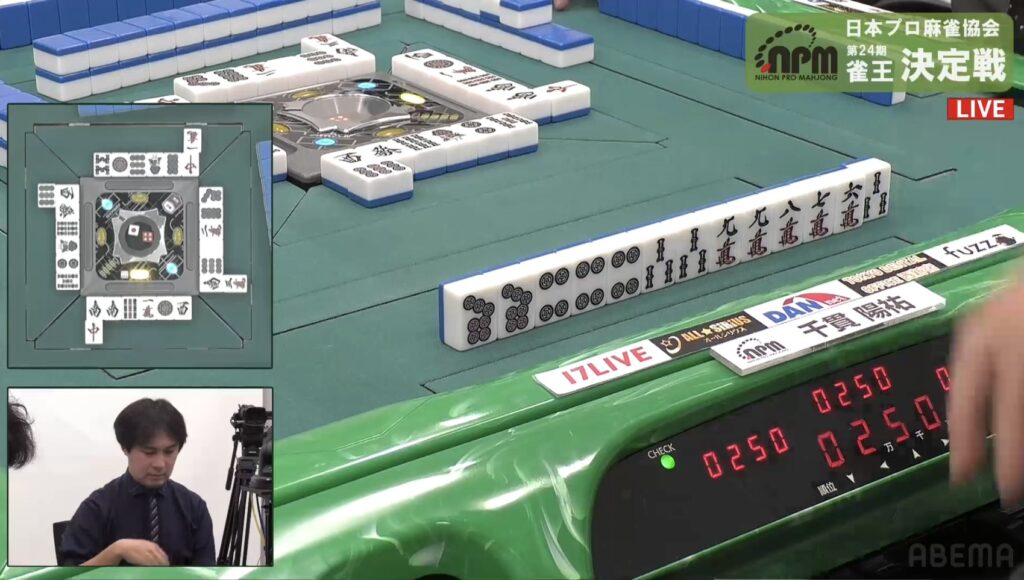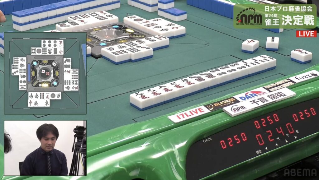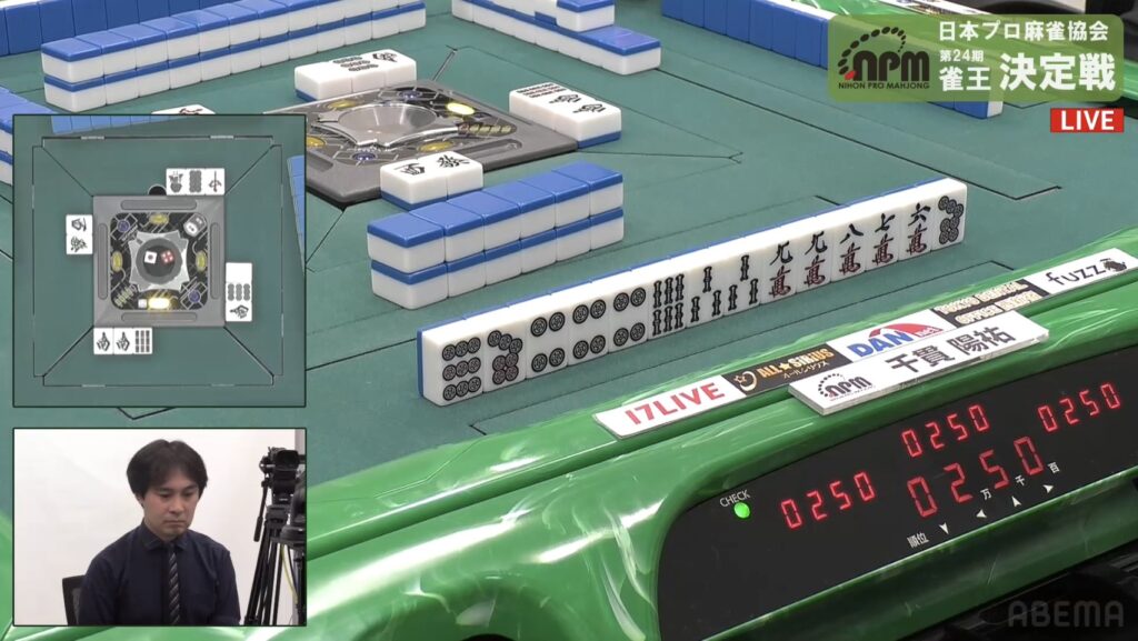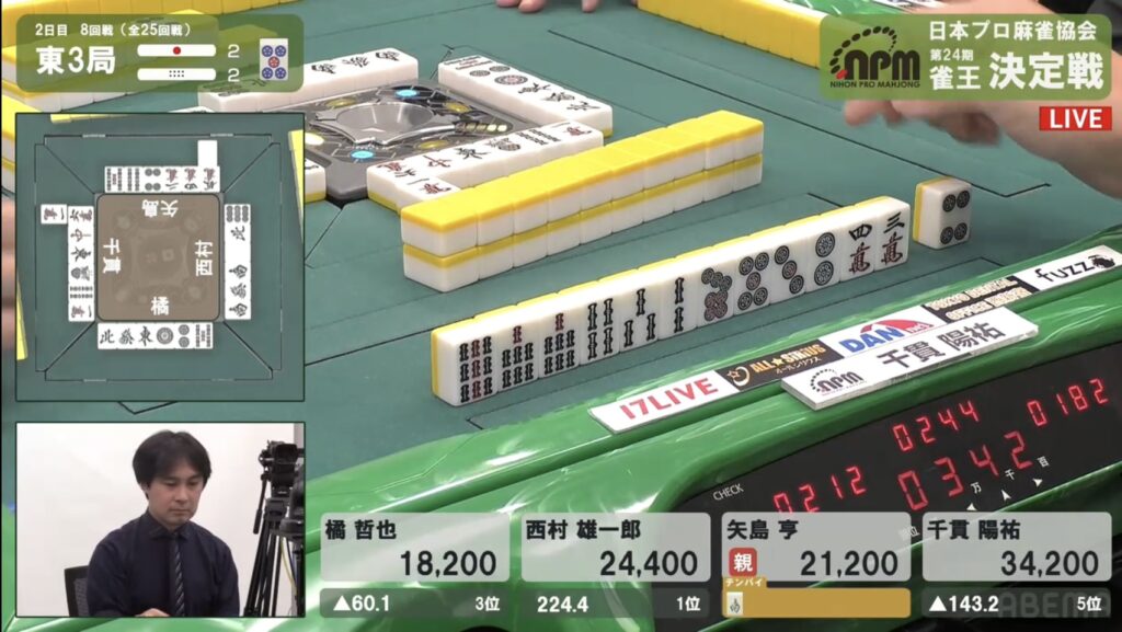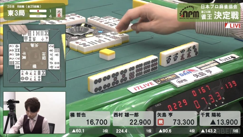 矢島に止められてしまったが、もう一枚のを千貫が引き当て3,000-6,000のツモアガリ。