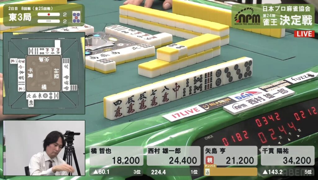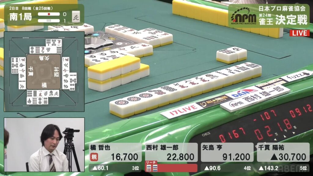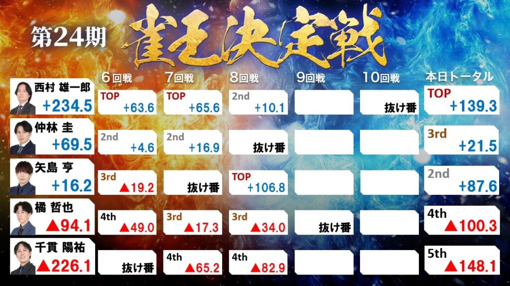 オーラスは西村が、あっさりと捌いて8回戦は終了。