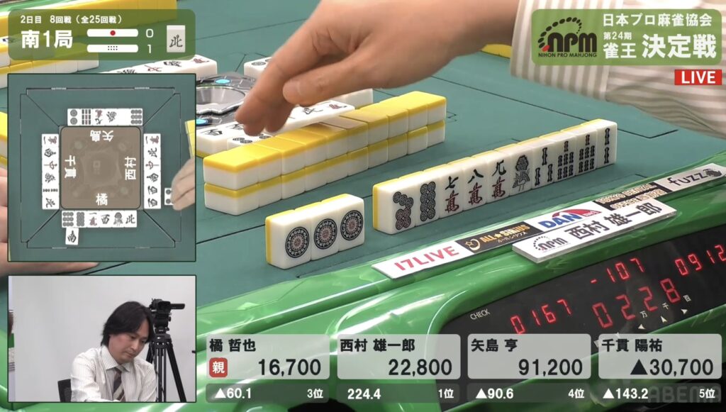 安全牌がない橘が放ったで西村が手牌を倒す。