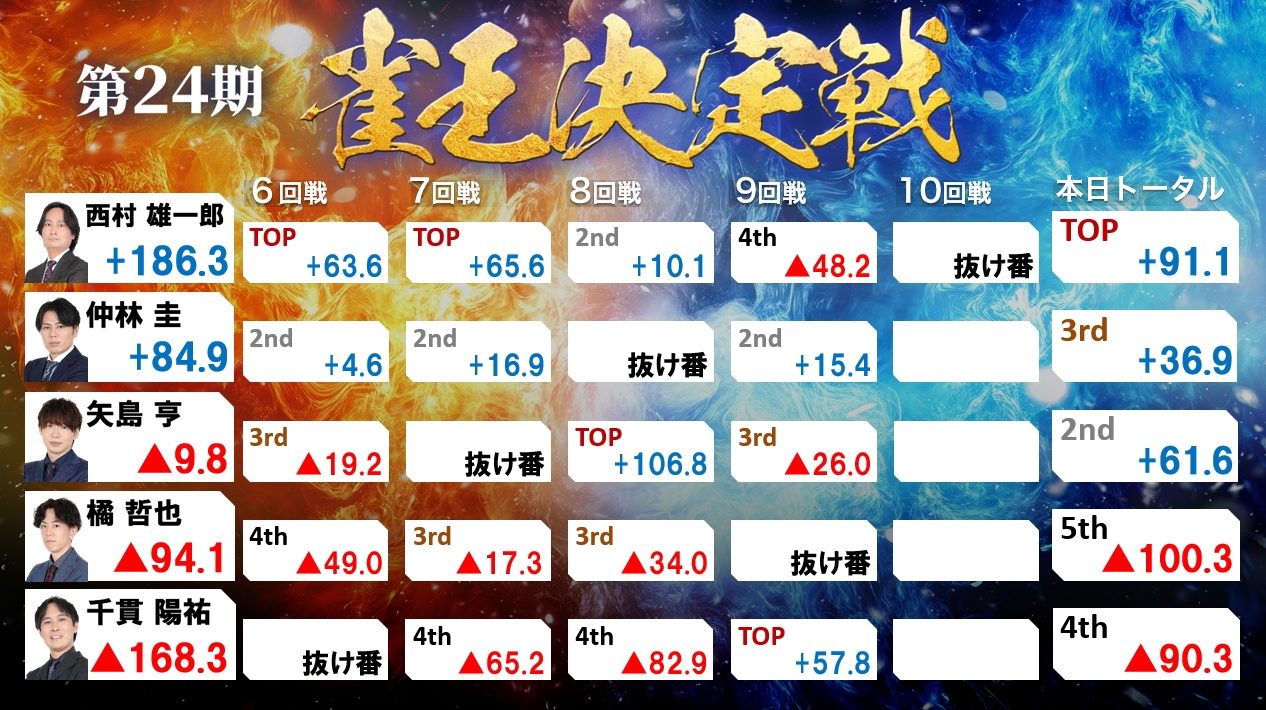 西村は10回戦の抜け番なので、この日までの首位がほぼ確定しているが、約100P差となった2番手の仲林が差を詰めるのだろうか?