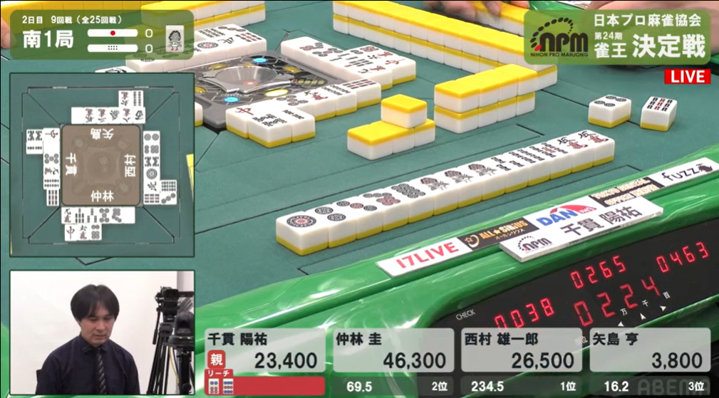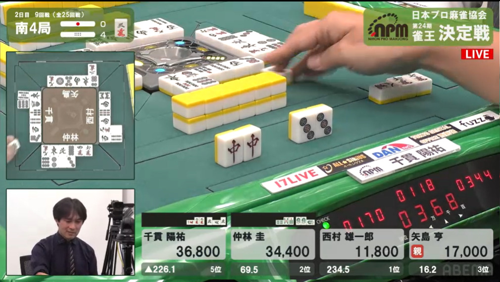3本場、矢島の1人ノーテン、4本場、千貫と西村の2人テンパイとなった5本場、仲林がピンフドラ1のリーチを一発でツモって満貫。再び両者の点差は拮抗する。