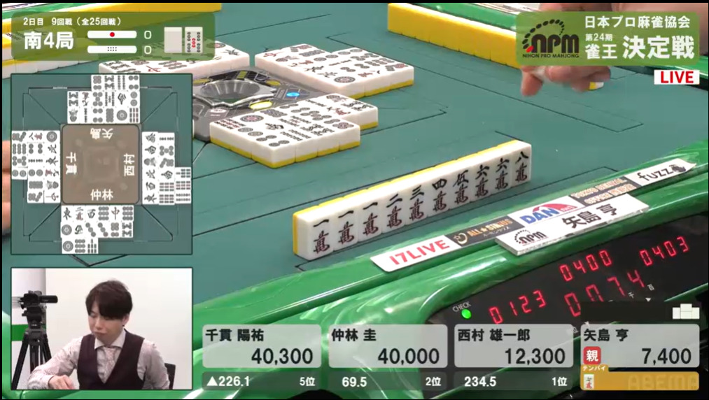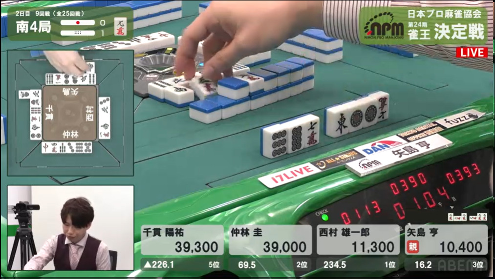 このテンパネと積み棒が地味に大きい。このアガリで矢島は次局ノーテンでも3着キープ、西村ラスで終わらせる点差になったからだ。もちろんトップを目指したいが、早くアガれる手が入らずに西村に動きがあれば、危険をおかさずに流局、強制終了を選ぶだろう。