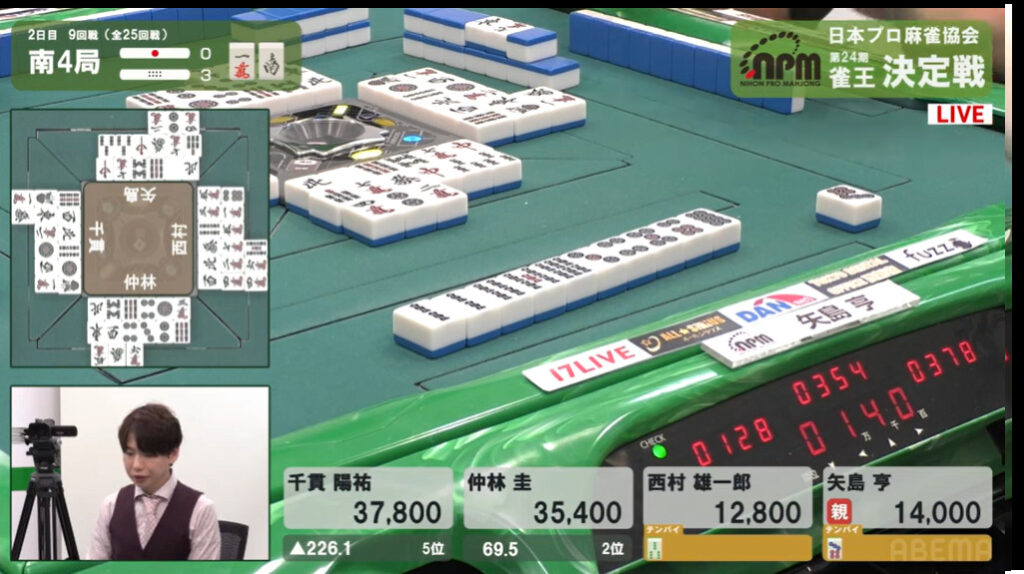この12000直撃で千貫が35400、仲林34300点、わずか1100点差でトップ目に立った。