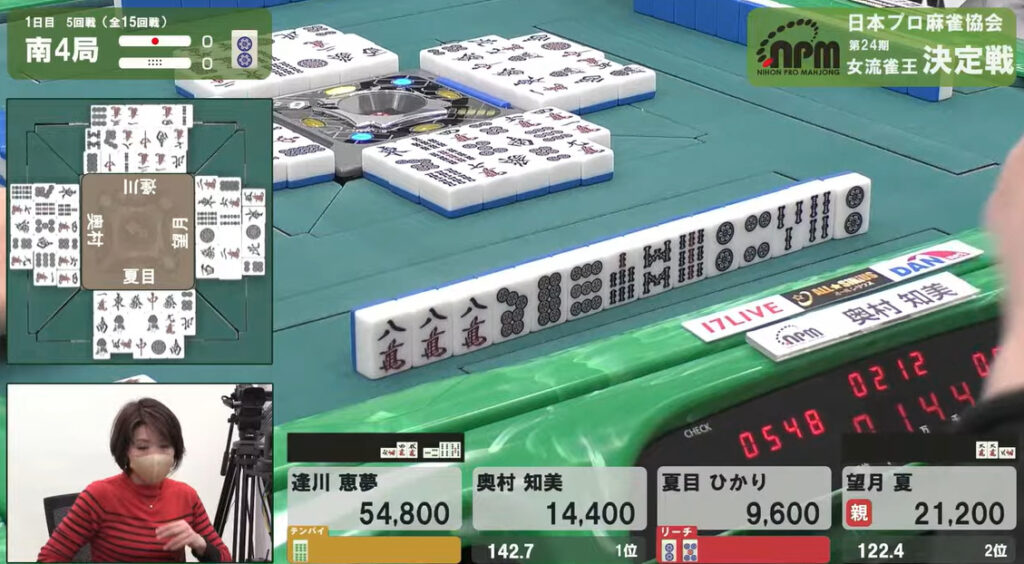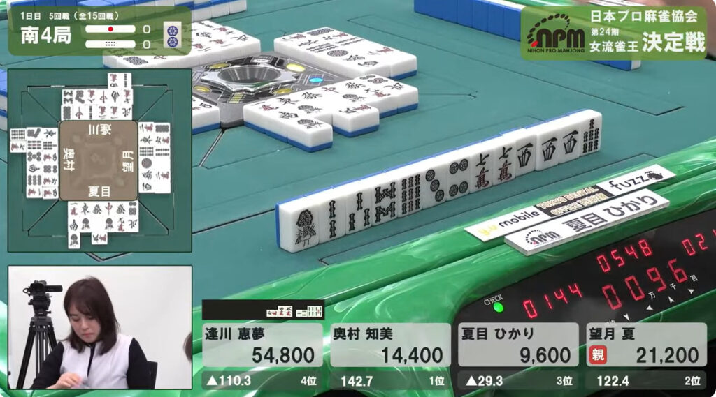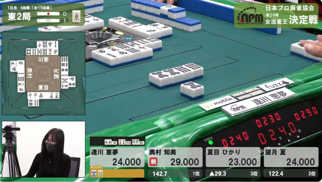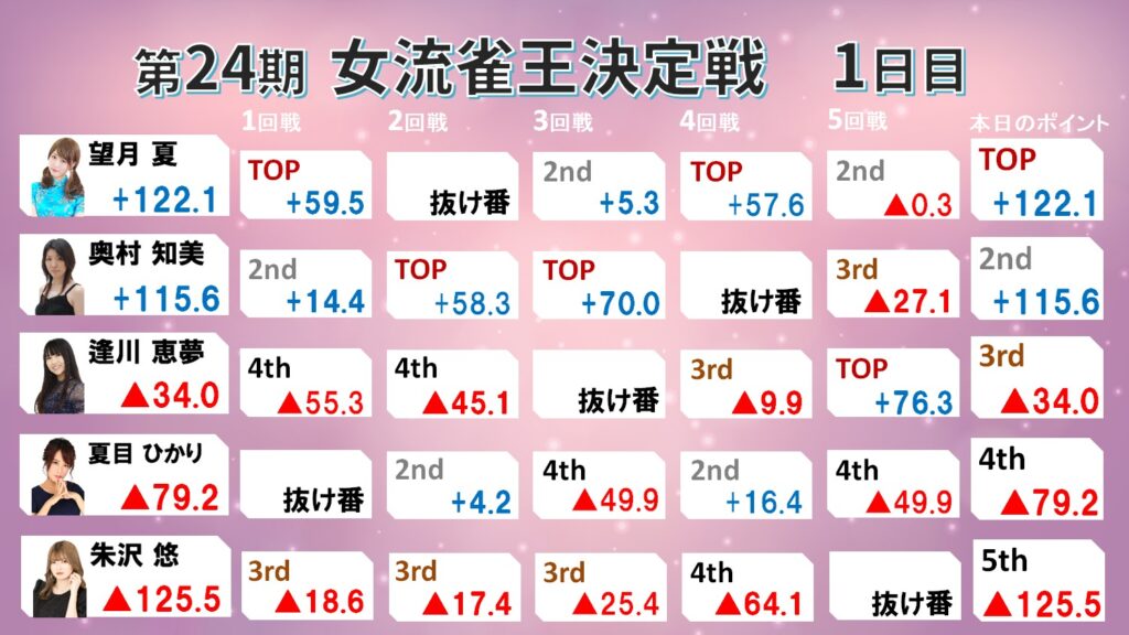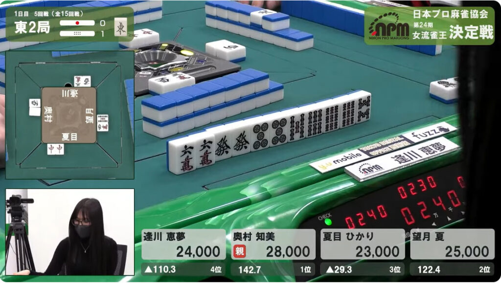 この結果、望月が奥村をわずかに躱して首位に。74.3Pの大トップを取った永世女流雀王がマイナスを大きく減らし、2人と約150P差となった。