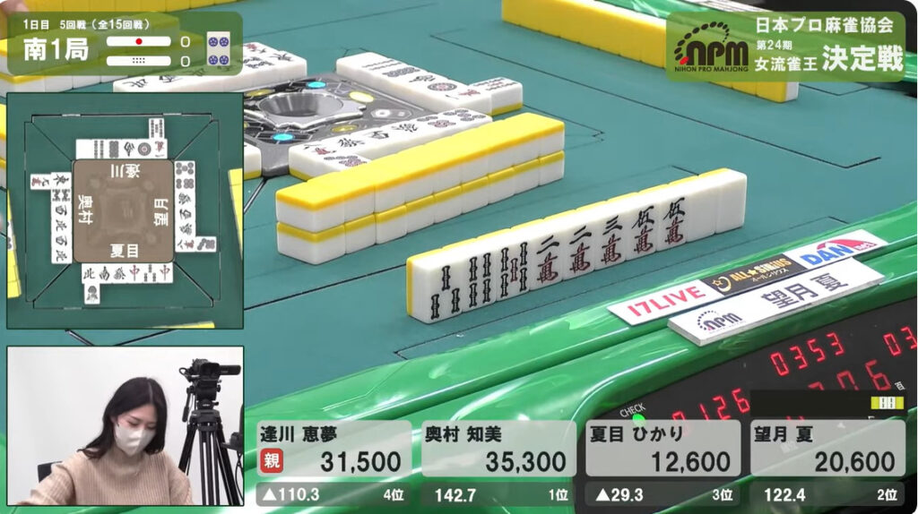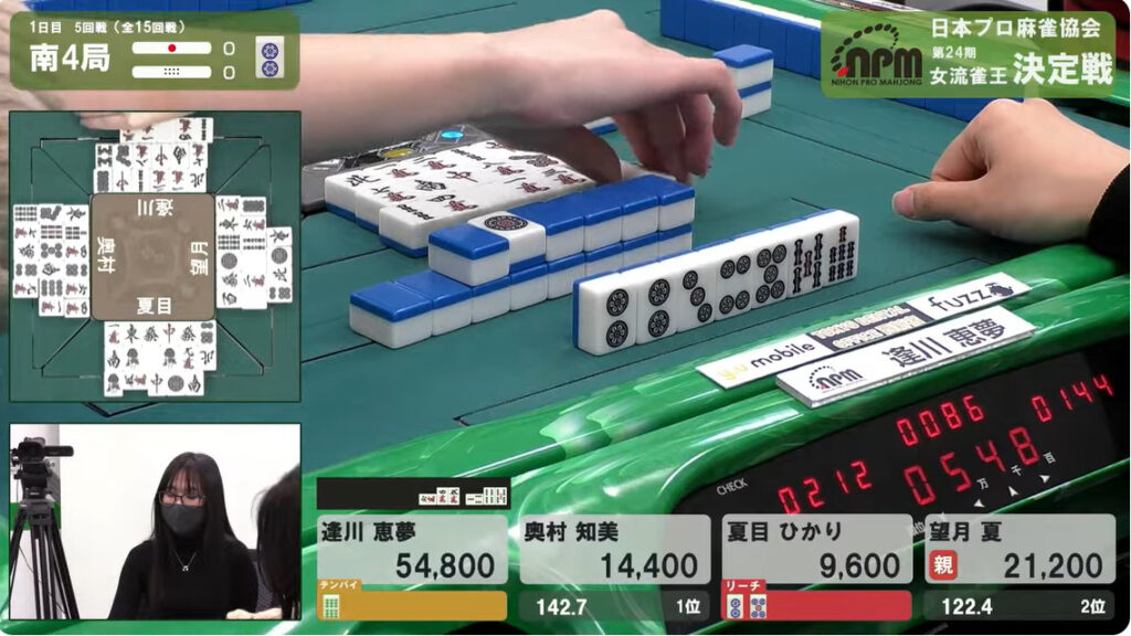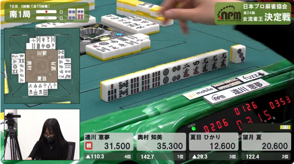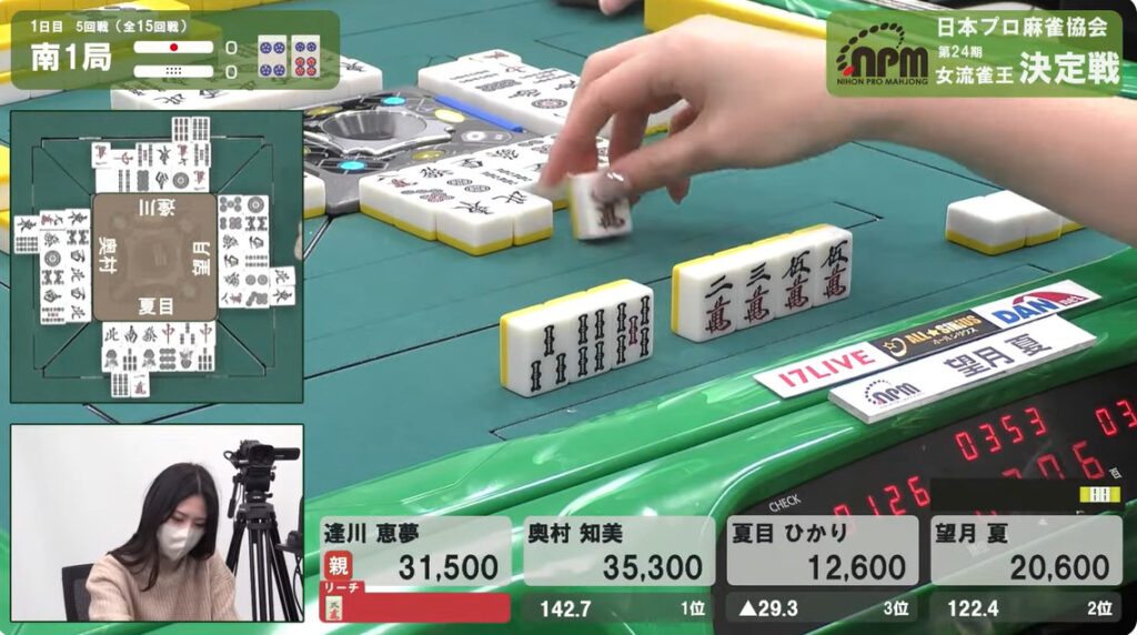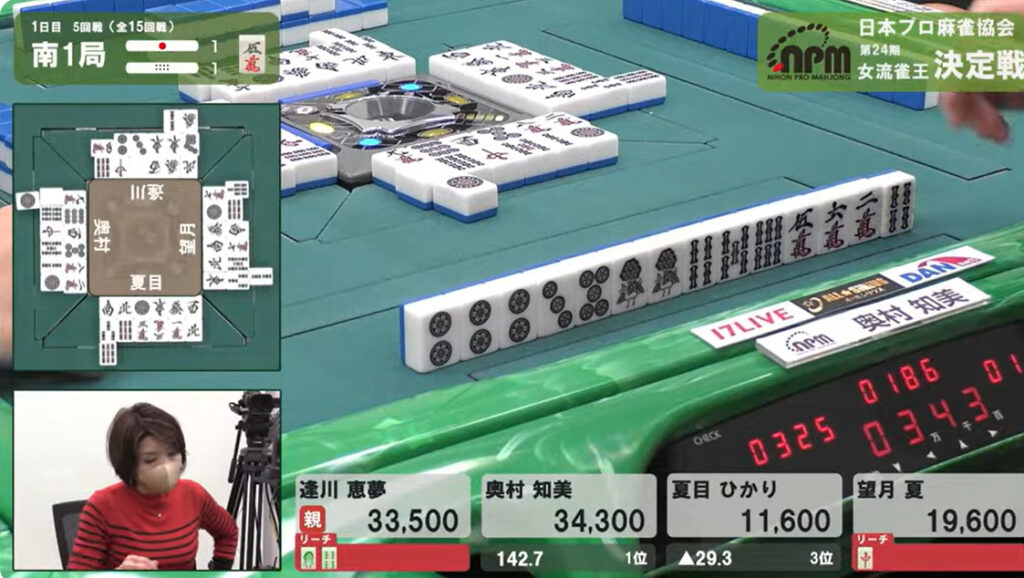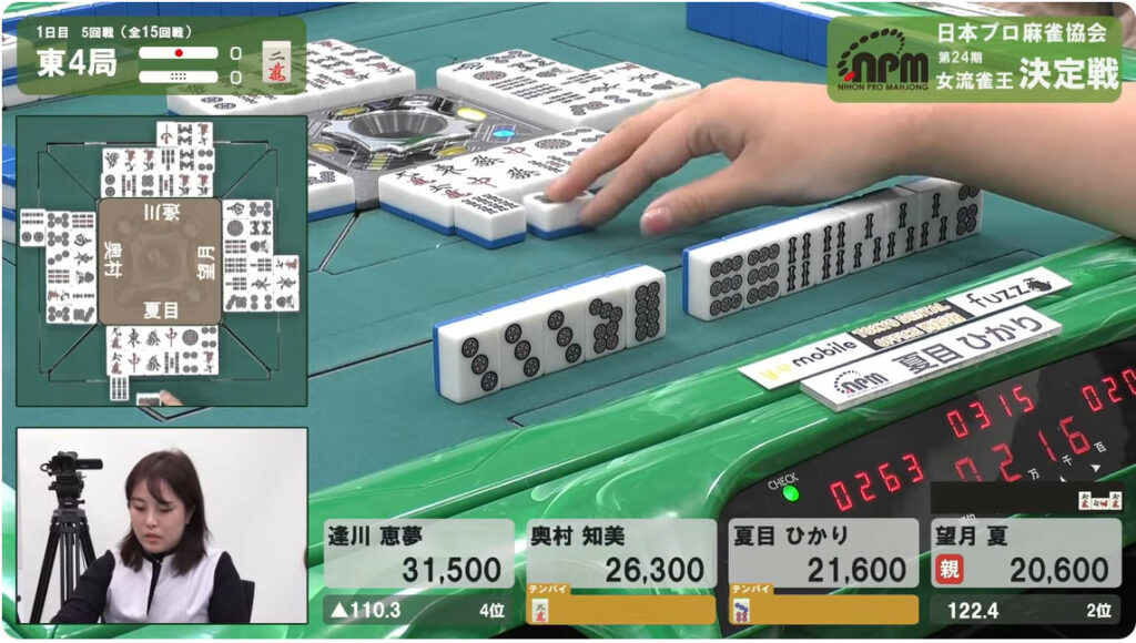 ラス親の望月は、トップまで33600点と遠い。というよりも、奥村より上ならばOKだろう。流局で終わらすシナリオはできていた。だから、夏目からこのリーチが入った後は無抵抗。
