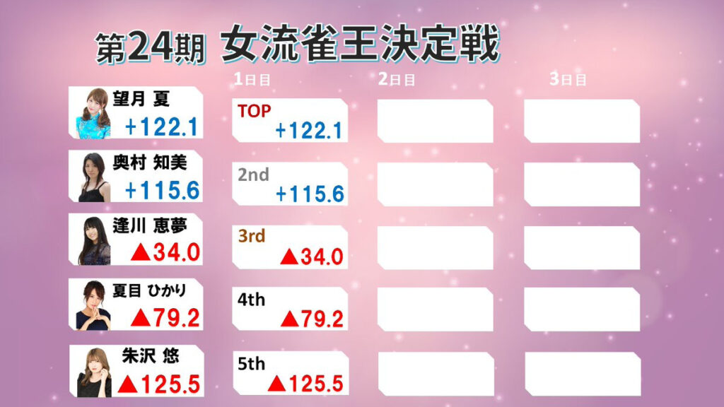 首位の望月が+122.1ptで、2位の奥村が+115.6pt。その差はわずかに6.5ptだ。奥村はこの6回戦、連対を取ることができれば、いったんトータル首位に立つことができる。