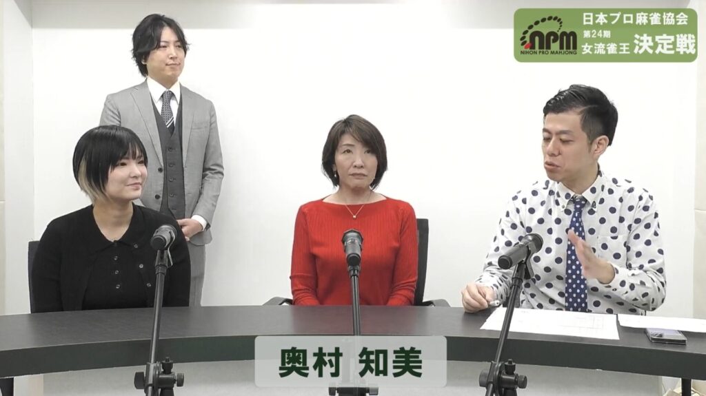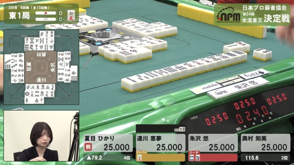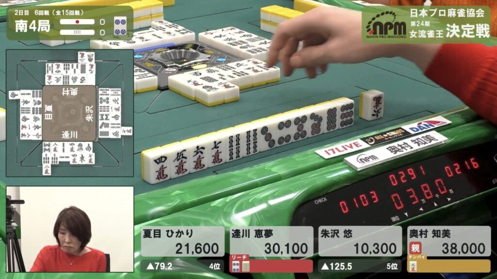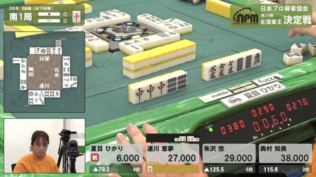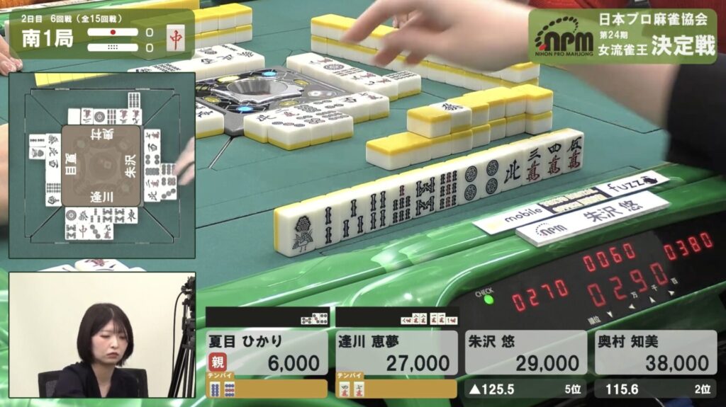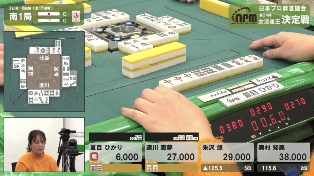 6回戦トップは、奧村知美。トータル首位の望月夏不在の半荘を、きっちりトップで飾った。