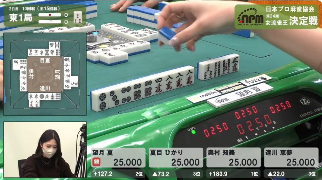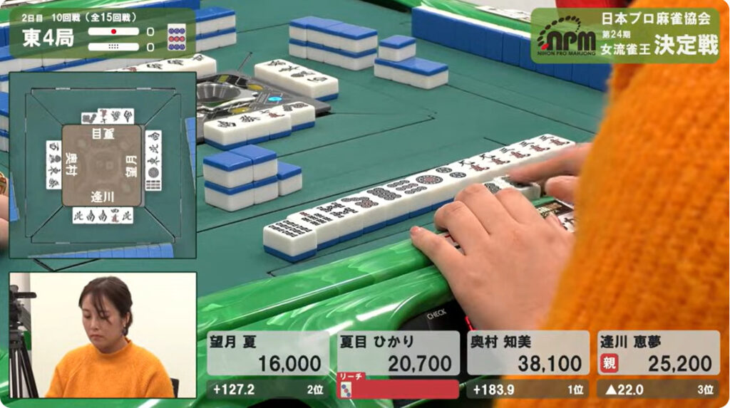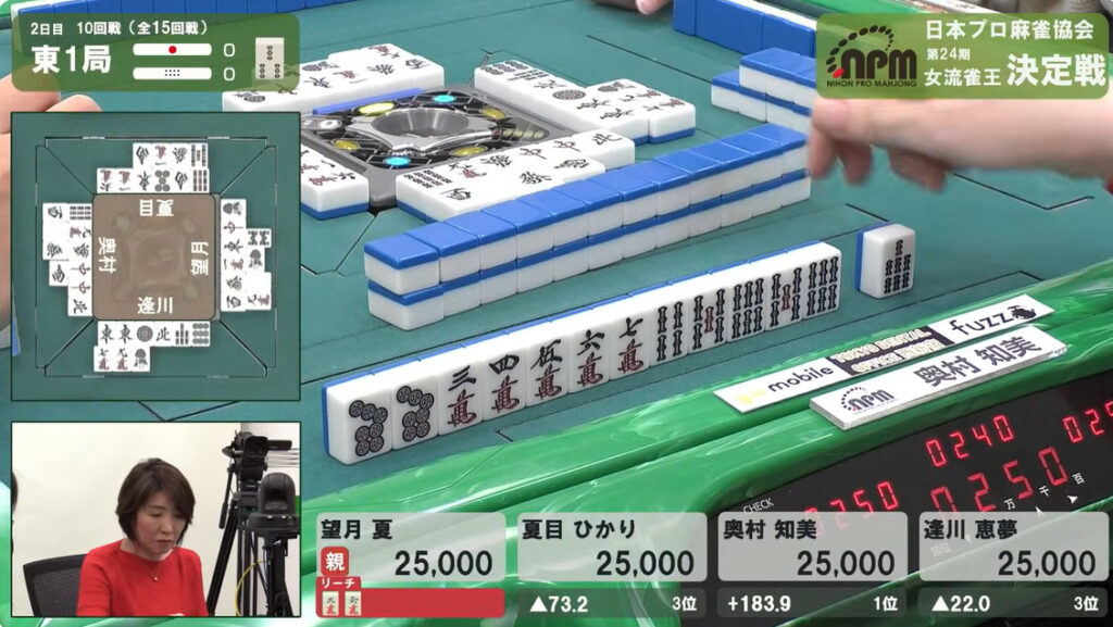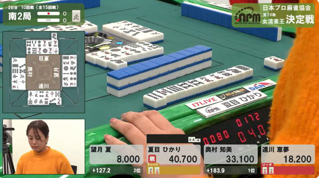 1本場は望月と夏目がリーチ。結果は夏目が放銃。3900+300。