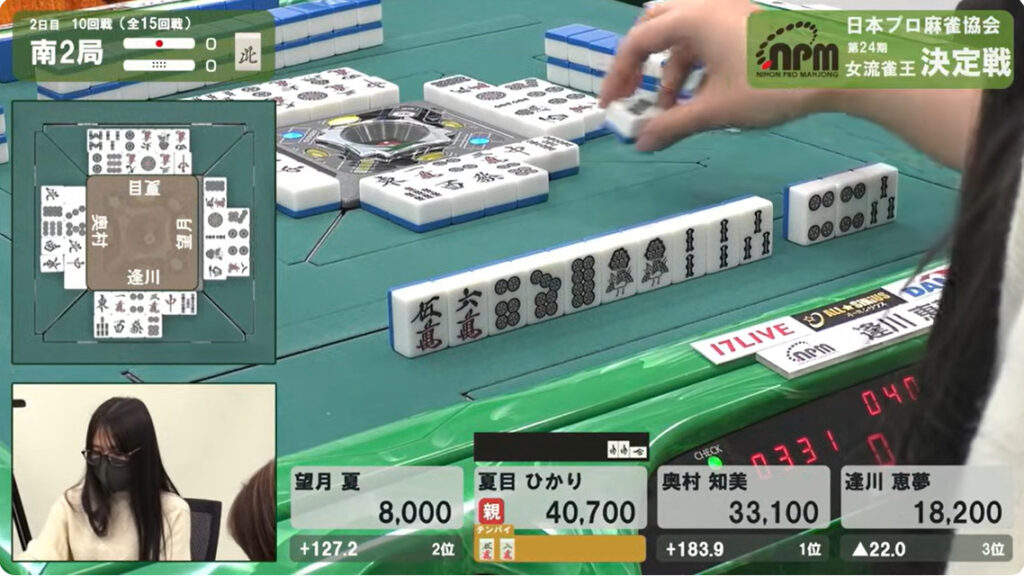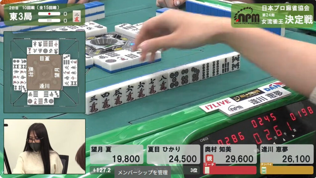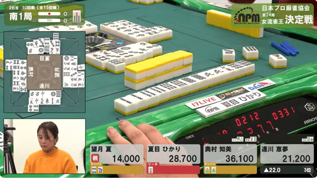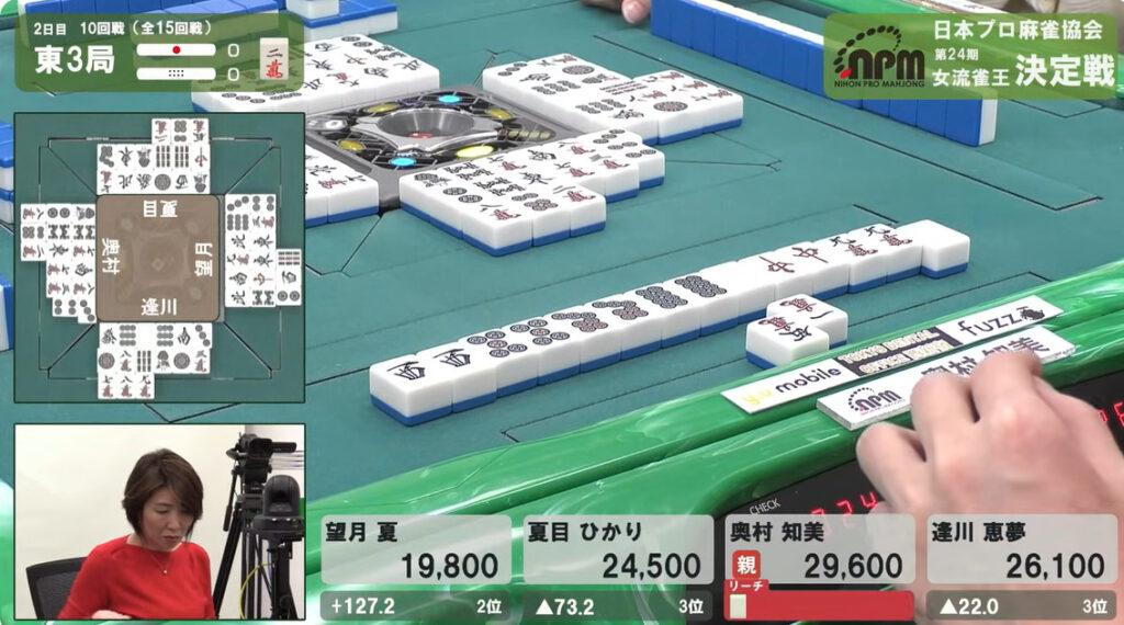 次巡、奥村がタンピンで追っ掛ける。こちらは–