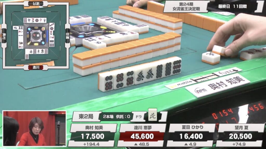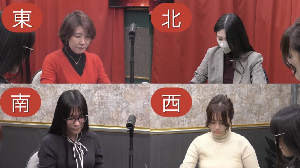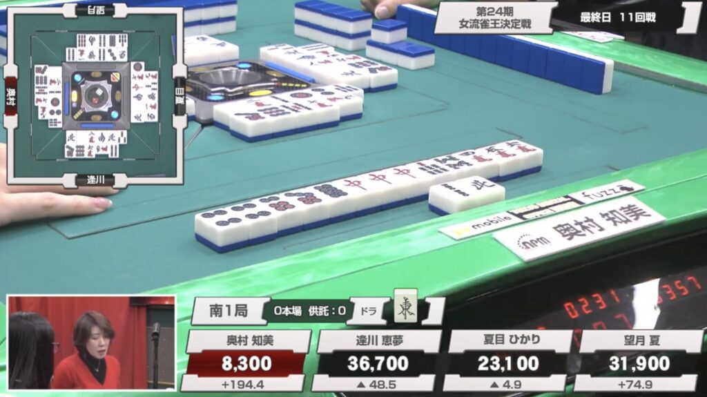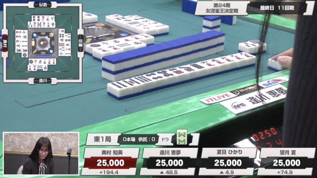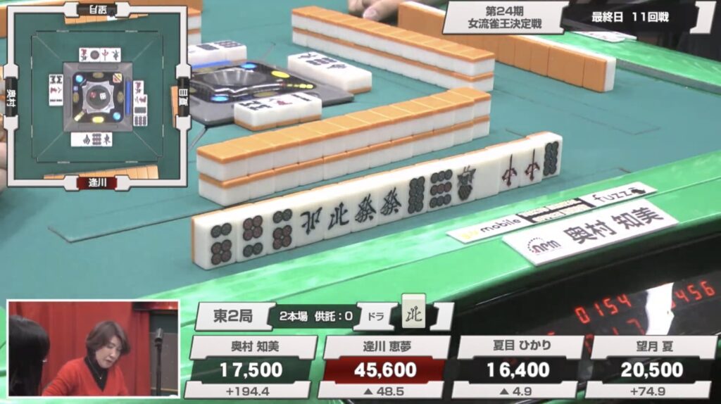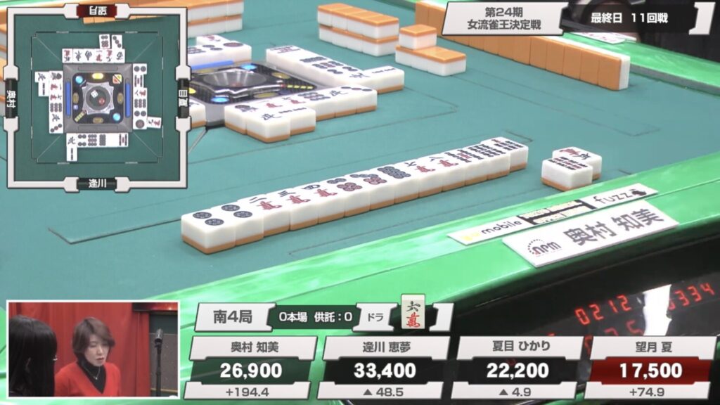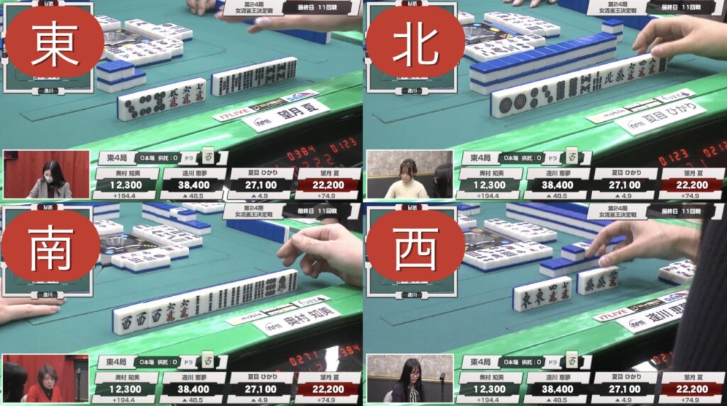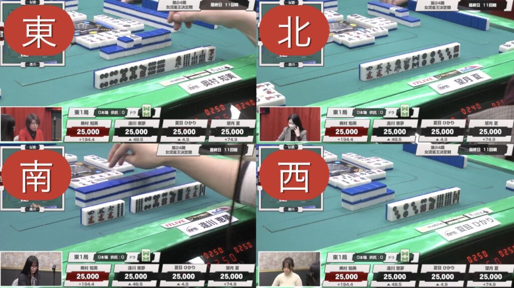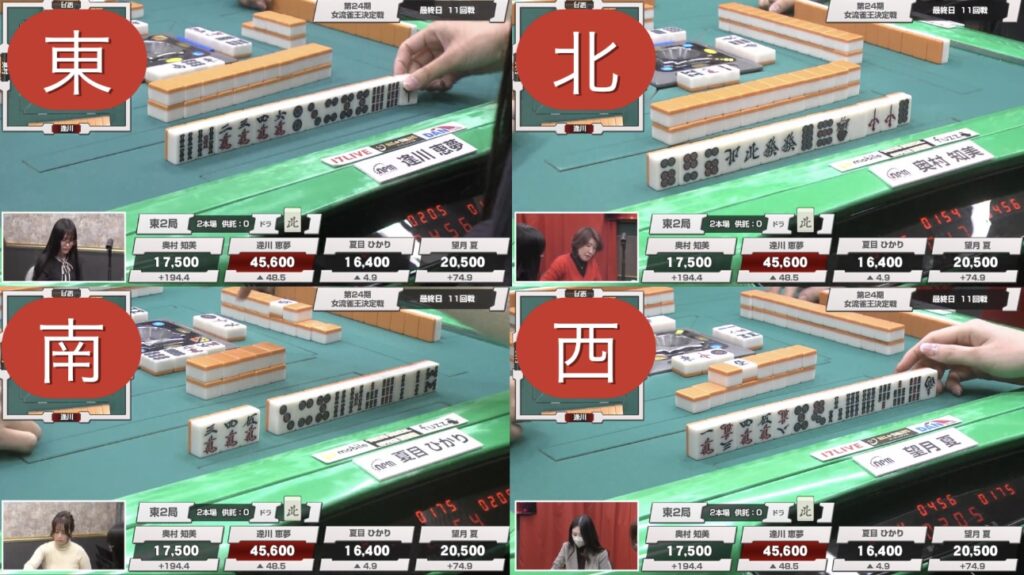2日目の5半荘(全10回戦)を終えて、首位の奥村知美が東家、4位の逢川恵夢が南家、3位の夏目ひかりが西家、2位の望月夏が北家に座る。