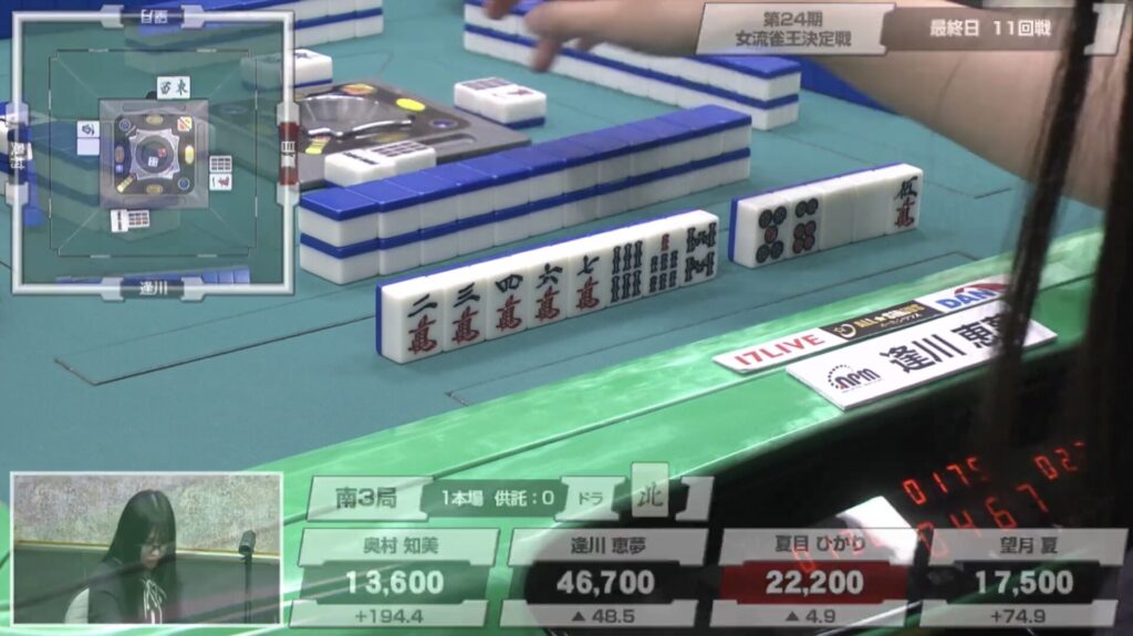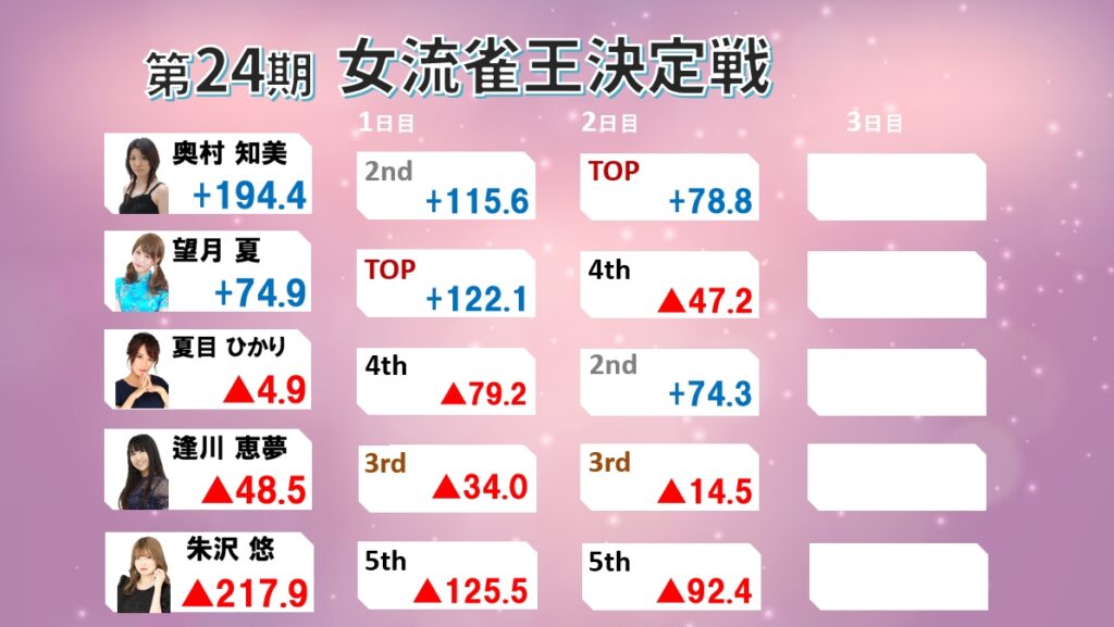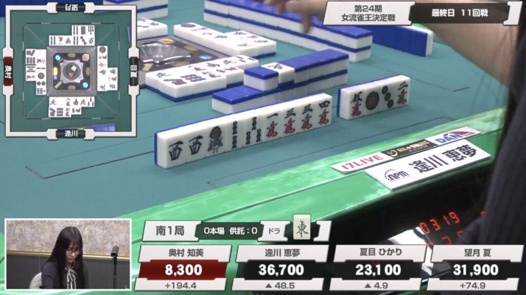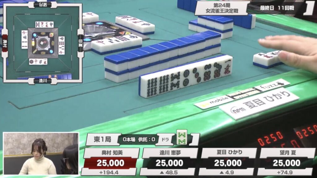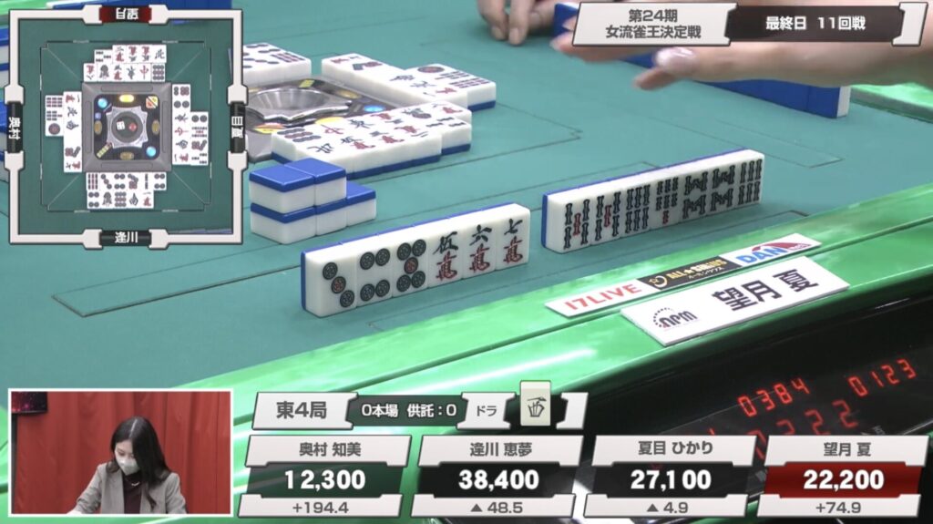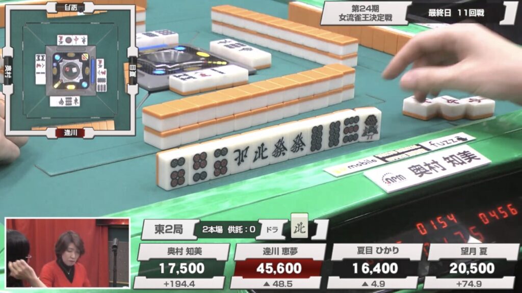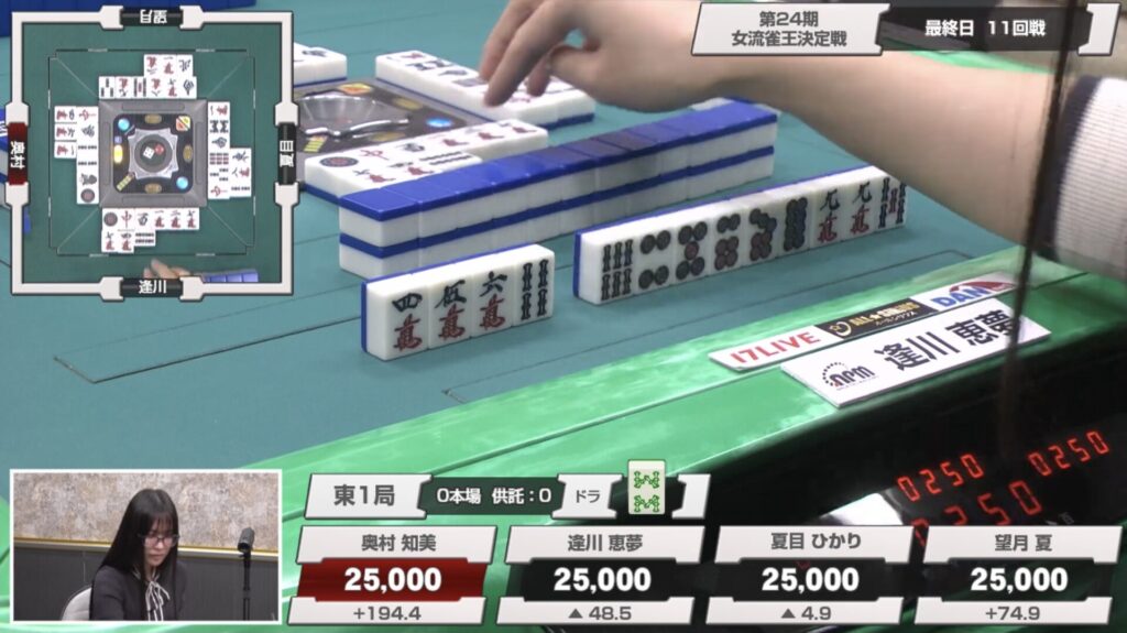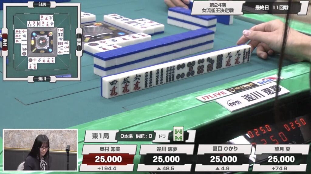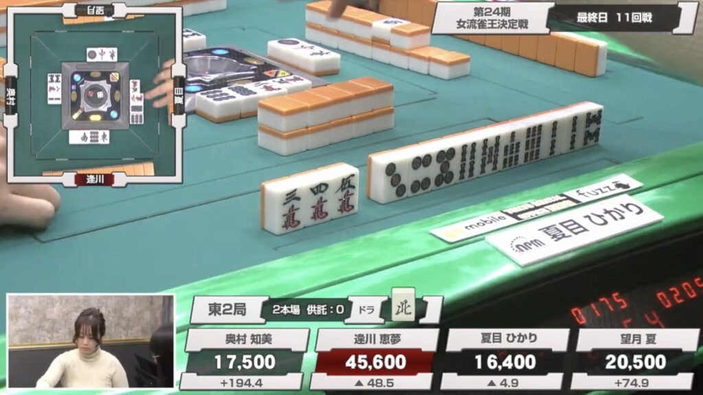 2日目の5半荘(全10回戦)を終えて、首位の奥村知美が東家、4位の逢川恵夢が南家、3位の夏目ひかりが西家、2位の望月夏が北家に座る。