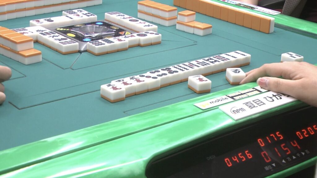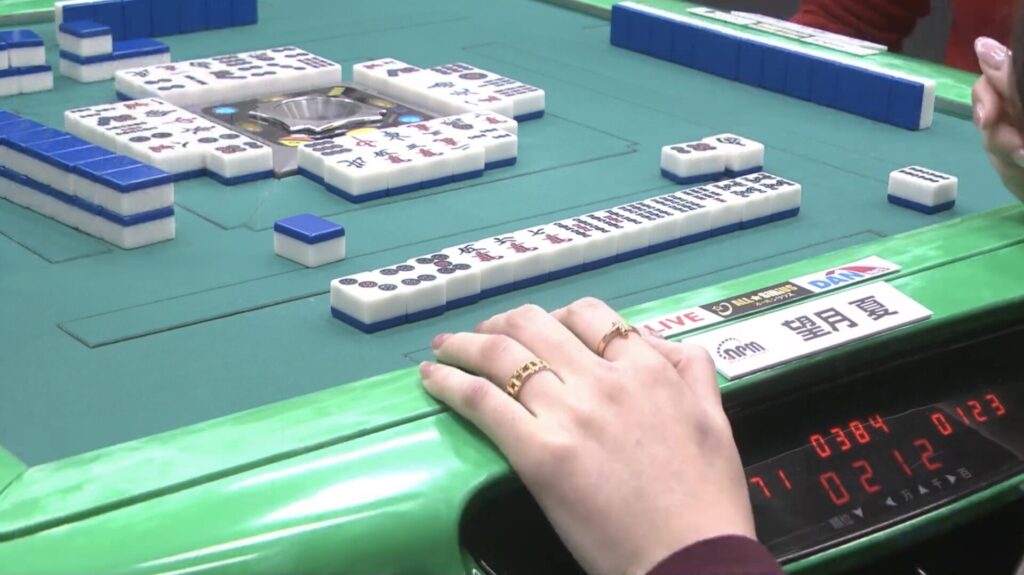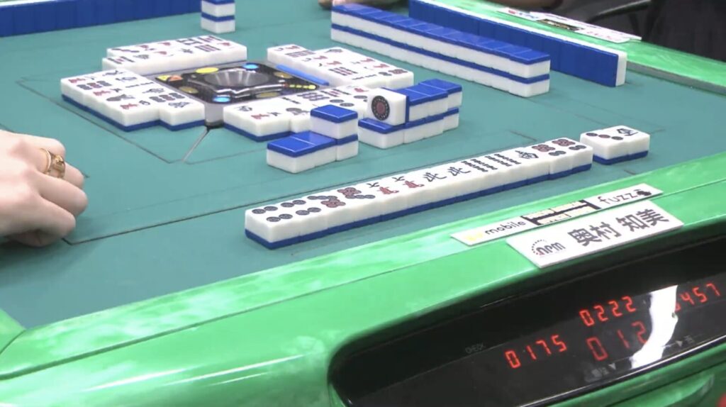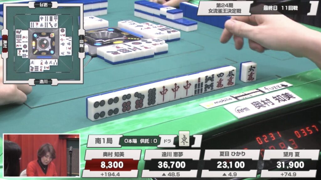 奥村は、オーラスも、夏目の先制リーチに追いかけリーチで応戦し、一発でロンアガリ。3900を手にして2着をキープした。