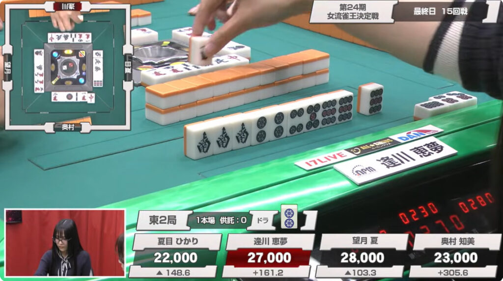 待ちでリーチ。親の夏目はすでに3位浮上の条件を満たしているので無理しない。