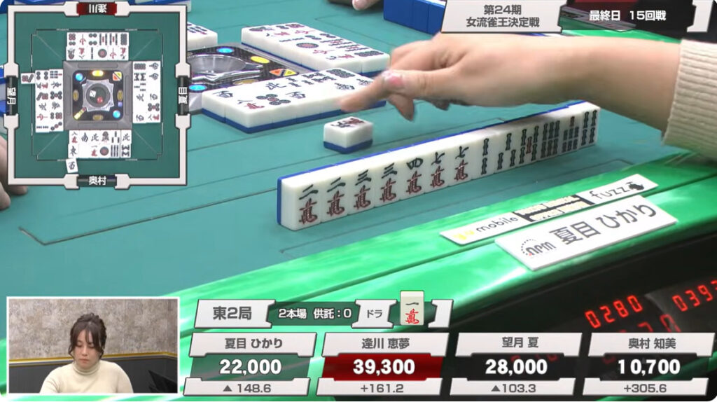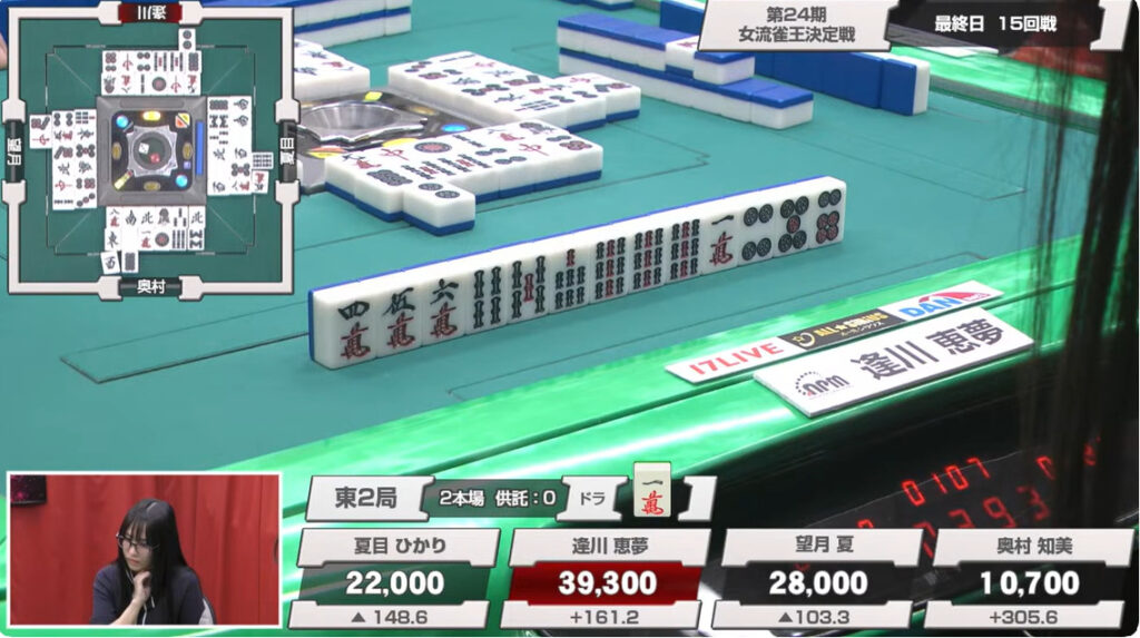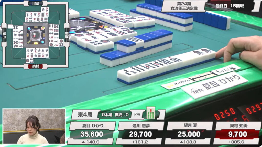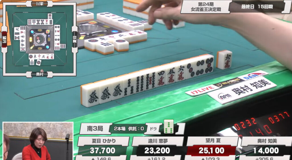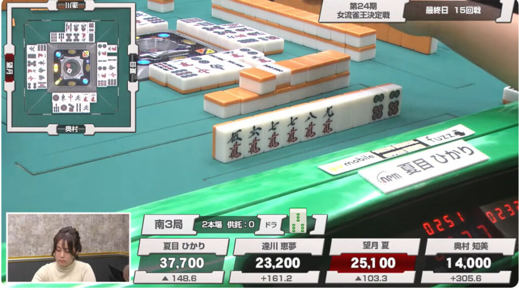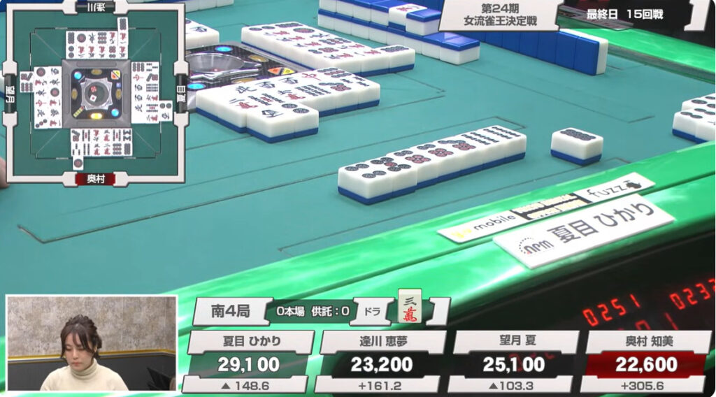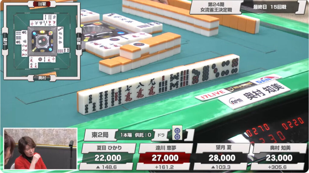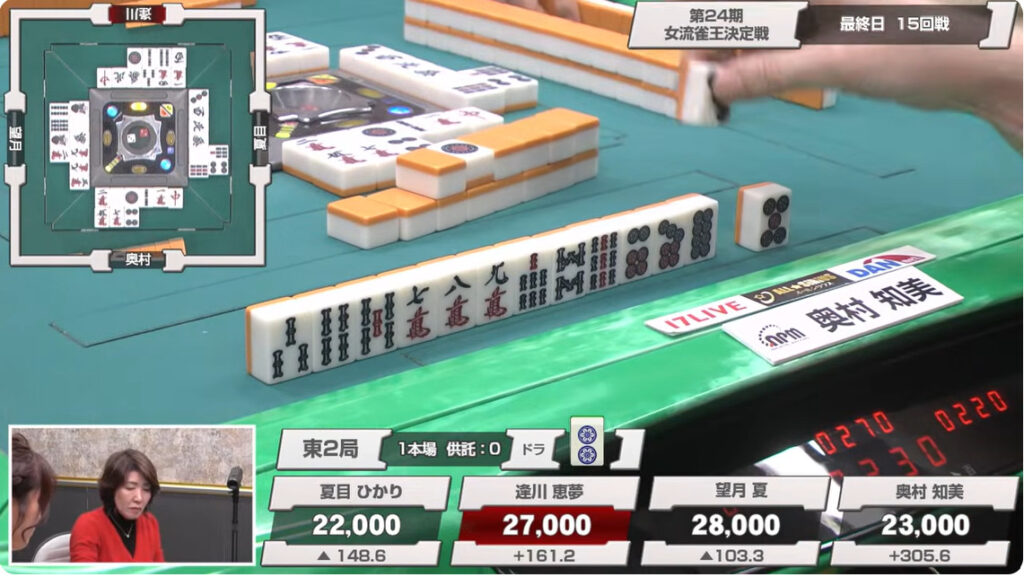 この夏目のアガリで奥村はホッとしただろう。逢川が点棒を減らしたこともさることながら、親が落ちたからだ。