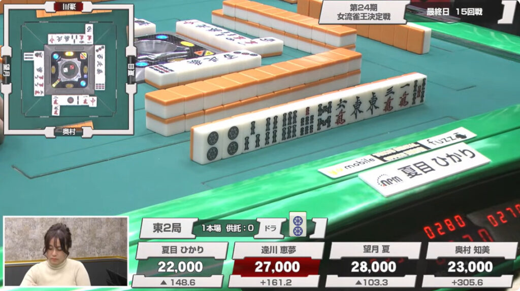 東3局、夏目がリーチツモ裏1で1000・2000。これでトップ目に立つと同時にトータル3位に浮上。