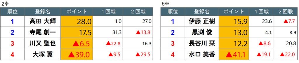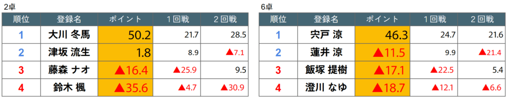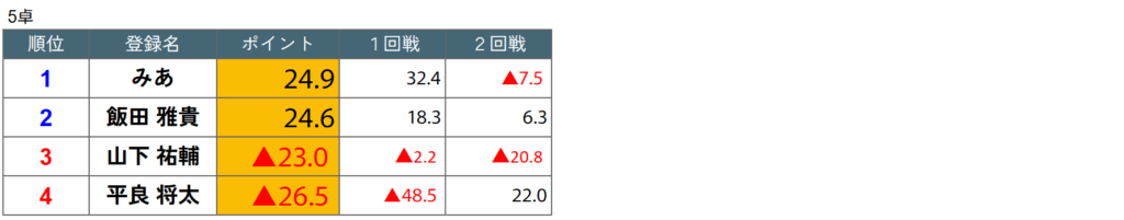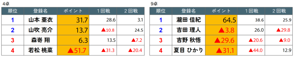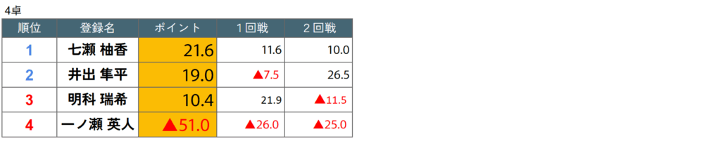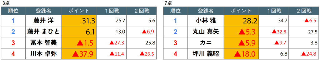 | 7 | 三好 ほたる | -65.9 | -11.6 | 4 | -26.6 | -0.3 | 3 | -5.3 | -19.0 | 4 | -34.0 | 0.0 | 0.0 | ||||
