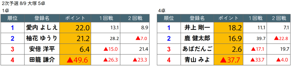 | 4 | 那波 ゆい | 36.6 | 33.3 | 1 | 48.3 | -10.5 | 4 | -25.5 | 8.8 | 2 | 13.8 | 0.0 | 0.0 | ||||