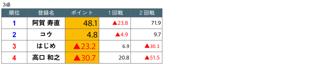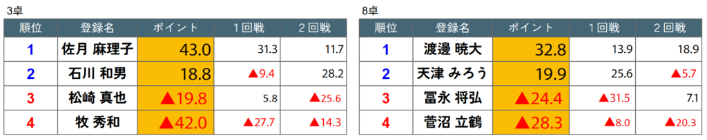 | 8 | 村松 光成 | -80.8 | -12.1 | 4 | -27.1 | -18.0 | 4 | -33.0 | -5.7 | 4 | -20.7 | 0.0 | 0.0 |