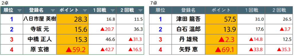 | 4 | 中西 正寛 | 16.8 | 7.1 | 1 | 22.1 | -8.2 | 4 | -23.2 | 12.9 | 2 | 17.9 | 0.0 | 0.0 | ||||