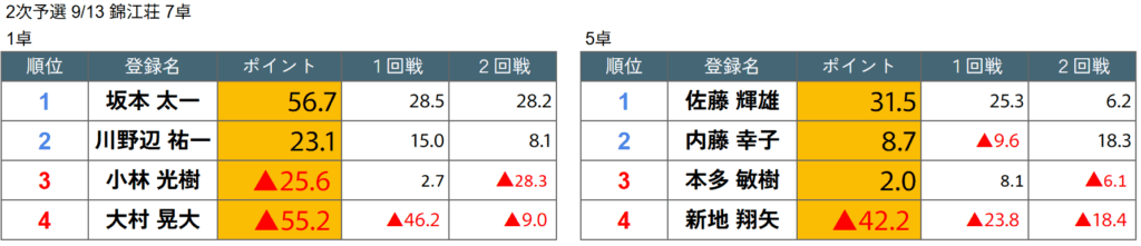 | 10 | 信楽 暁 | 23.2 | 32.3 | 1 | 47.3 | -9.4 | 3 | -14.4 | -4.7 | 3 | -9.7 | 0.0 | 0.0 | ||||