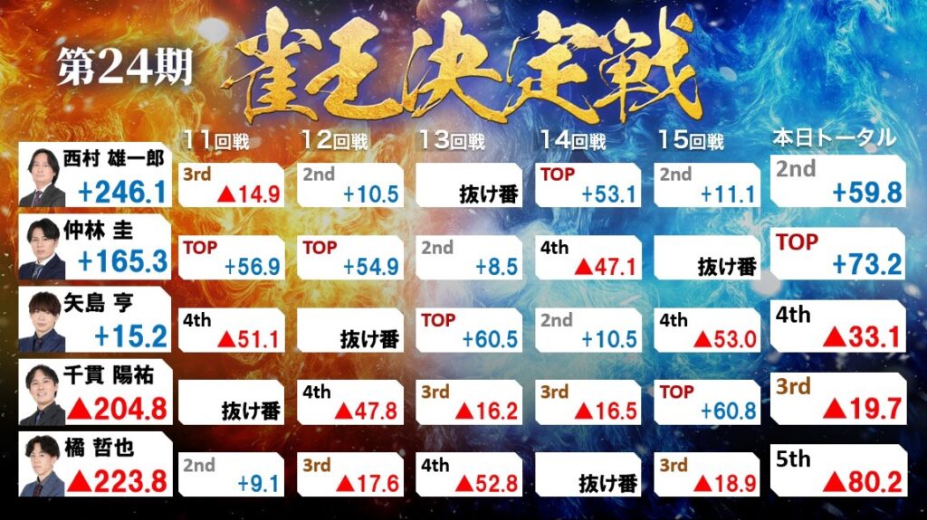 | A卓 | 渋川 難波 | -30.2 | -15.3 | 3 | -25.3 | -8.3 | 3 | -18.3 | 8.7 | 1 | 58.7 | -15.3 | 4 | -45.3 | 0 | ||