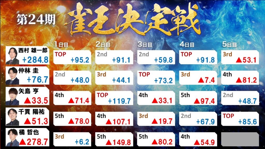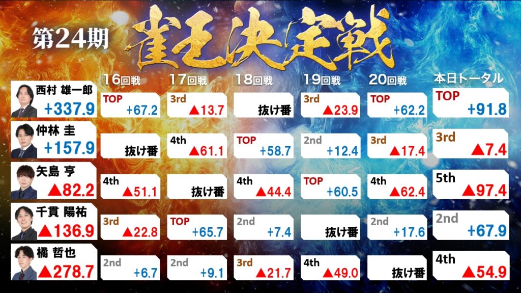 | B卓 | 浅井 堂岐 | -37.7 | 14.5 | 1 | 64.5 | -10.0 | 3 | -20.0 | -27.5 | 4 | -57.5 | -14.7 | 3 | -24.7 | |||